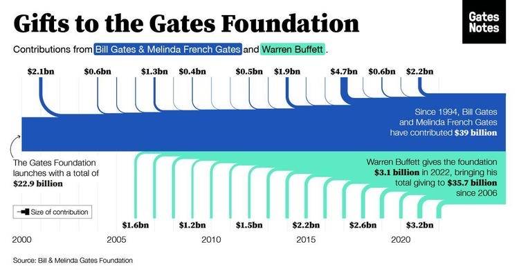 ![]() 在推特上,他解释其行为的目的:将自己拥有的资源回馈给社会是一种义务,并呼吁其他在榜的亿万富翁也能加入到他的“散财”之路。他还在推特上贴出其与前妻梅琳达(Melinda)在2000年创立的联名基金会的捐助历史,根据该图,这两人的基金会自1994年来已经捐献超过390亿美元。而股神巴菲特自2006年开始加入该基金会,截至目前他共为基金会提供了357亿美元的资金。 ![]() 而200亿美元捐出后,盖茨基金会总的捐赠资金额将达到700亿美元,同时支出将会提高一半,在2026年达到每年90亿美元。这笔捐款也将使盖茨前夫妇的捐款达到550亿美元,成为历史上最大的慈善家。 ![]() 根据彭博实时富豪榜,比尔·盖茨以1130亿美元身家位列全球富豪第四,一年以来财富缩水251亿美元。比尔及梅琳达·盖茨基金会成立于2000年,盖茨于2008年辞去微软CEO职务,专注于基金会工作。比尔·盖茨在博客中特别提到,迄今为止,基金会基本上有一半的资源来自沃伦·巴菲特。自2006年以来,沃伦已向该基金会捐赠了357亿美元,其中包括最近在6月份捐赠的31亿美元。比尔及梅琳达·盖茨基金会在一份通稿中称,比尔·盖茨捐赠200亿美元,超额兑现了他和梅琳达·弗兰奇·盖茨在去年夏天做出的捐资150亿美元的共同承诺,加上来自巴菲特的捐赠,这两笔捐资将使盖茨基金会的总资金达到约700亿美元。此外,自1994年起,比尔·盖茨和梅琳达·弗兰奇·盖茨已向基金会捐资390亿美元。2000年以来,盖茨基金会共支出792亿美元赠款。 |