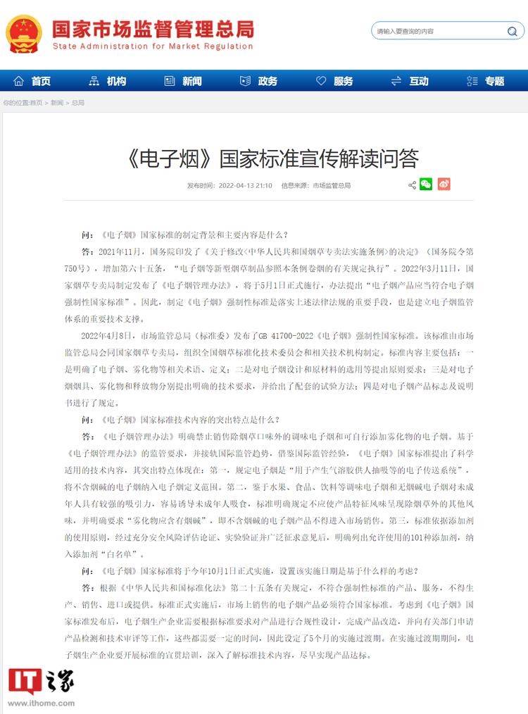 届时所有水果味电子烟将下架,全国统一电子烟交易管理平台只提供国标烟草口味电子烟和具有儿童锁的烟具。 2022 年 4 月 8 日,市场监管总局(标准委)发布了 GB 41700-2022《电子烟》强制性国家标准。该标准由市场监管总局会同国家烟草专卖局,组织全国烟草标准化技术委员会和相关技术机构制定。标准内容主要包括:一是明确了电子烟、雾化物等相关术语、定义;二是对电子烟设计和原材料的选用等提出原则要求;三是对电子烟烟具、雾化物和释放物分别提出明确的技术要求,并给出了配套的试验方法;四是对电子烟产品标志及说明书进行了规定。 另外,今年 3 月份国家烟草专卖局发布《电子烟管理办法》的公告,自 2022 年 5 月 1 日起施行。其中关于销售管理,《办法》提到,禁止向未成年人出售电子烟产品,对难以判明是否是未成年人的,应当要求其出示身份证件;禁止销售除烟草口味外的调味电子烟和可自行添加雾化物的电子烟。 ![]() |