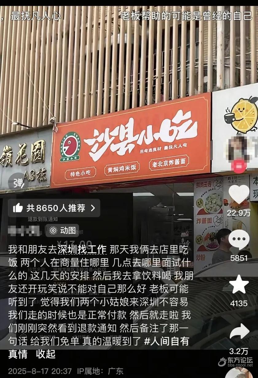 吃完饭 钱却突然被退回账上? 还附赠了一句神秘留言 …… 近日 一段短视频 在网络上迅速走红 虽然画面只定格在一张照片上 却已收获数十万点赞 让众多网友直呼 “真的太温暖了!” ![]() 8月16日 两位刚刚大学毕业 来深圳求职的女生 来到一家小吃店 边吃饭边商量找工作的事 吃完离开之后 手机上突然收到了一笔退款 毕业生边吃边聊找工作 老板默默行善举 小刘和小宋是今年到深圳求职的毕业生,16日下午,两人一起到深圳龙岗一家沙县小吃店吃饭。两人边吃边商量求职实习的事,吃完饭之后就离开了,在傍晚六点左右,手机突然收到了13元的退款。 ![]() 她们起初还以为是系统出错,仔细一看,才发现是小吃店主动退回的,备注栏里还写着“加油,免单!”等字眼。事后两名毕业生把这件事发到了视频平台上,一夜之间火了。 经询问,小吃店老板潘先生说:“是我的合伙人把钱退了。他跟我说,两个小女孩不容易。我就觉得这是一个善举。我妈当时听了也跟我说,她们出来能帮就帮一点。” 虽然金额不大 但“暖一点是一点” 潘先生此前经历过几次创业,也是两个孩子的爸爸。今年3月开始跟合伙人黄先生一起经营这家小吃店。 ![]() 看到两位女生的情况,潘先生心里非常能共情。他说虽然金额不大,但是能让她们温暖一点是一点,自己是做餐饮的,其他帮不上,请她们吃一顿饭,还是可以帮忙的。 两位求职毕业生表示:“我们当时最真实的感受是泪流满面,出门在外也是第一次可以感受到这种温暖的时刻。希望他生意兴隆,他会越来越好,我们都会越来越好。” 对于两位毕业生的感谢,潘先生和合伙人表示,人都有遇到困难或者低谷的时候。在这种时候,在自己的能力范围之内帮助别人,让其他人多甜一点是一点,这就是他们的初衷。也希望两位毕业生能顺利在深圳找到工作留下来。 潘先生表示,“这些都是小事,我也希望她们碰到同样情况的时候,也能有这样的小举动。不多,就一点点善举。” 网友对此评论 “永远会被这种人与人之间 最淳朴的温情所打动!” ![]() 这段发生在 深圳小吃店里的“13元免单” 没有宏大的仪式 却完成了一次温暖的交接 |