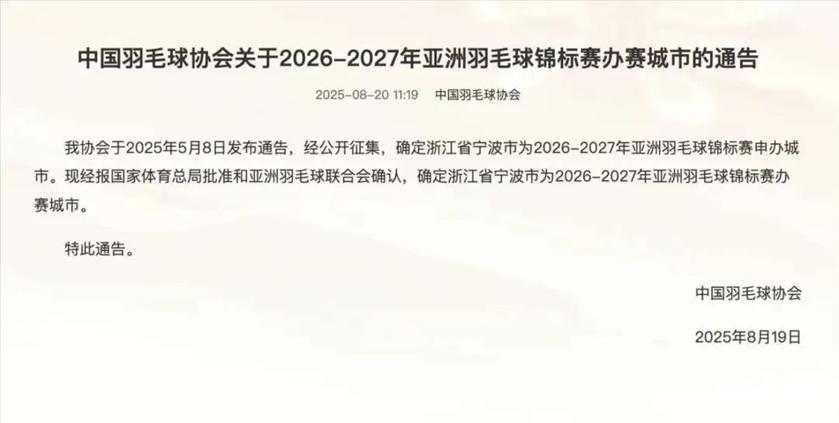 ![]() 近日 中国羽毛球协会发布公告 经国家体育总局批准 和亚洲羽毛球联合会确认 确定浙江省宁波市为 2026-2027年 亚洲羽毛球锦标赛办赛城市 ![]() 未来两年,羽毛球亚锦赛将和宁波“再续前缘”,全球的观众都能在宁波欣赏到亚洲羽毛球最高水平的对决。 梁伟铿/王昶(左)夺得2024羽毛球亚锦赛男双冠军。 宁波发布特约摄影师 胡龙召/摄 2024年4月,宁波首次举办羽毛球亚锦赛,中国羽毛球队在5个单项中夺得女单、男双和混双等3个项目的金牌。其中,宁波选手王昶和搭档梁伟铿2:1战胜马来西亚组合吴世飞/伊祖丁,在家门口登上男双项目最高领奖台。 2025年4月,羽毛球亚锦赛再度来到甬城。中国羽毛球队在女双和女单项目中夺冠,同时收获男单、男双和混双项目的银牌。比赛期间,累计约3.3万名观众到现场观赛,30余款周边产品销售量达3万件。