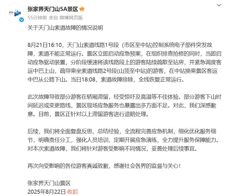 此次故障导致部分游客在轿厢滞留,经受惊吓及高温等不佳体验。部分游客下山时间延迟或变更路线,景区现场应急服务也暴露出多方面不足。对此,我们深感歉意。目前,景区正针对以上滞留游客进行退赔处理。