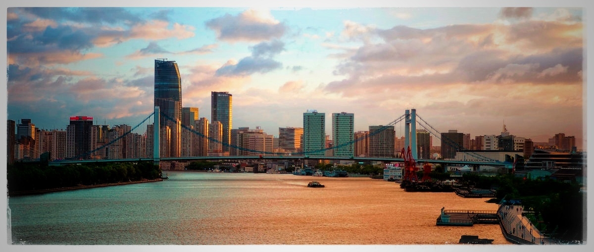漫天彩云下,浪漫的落日与远处的城市共辉