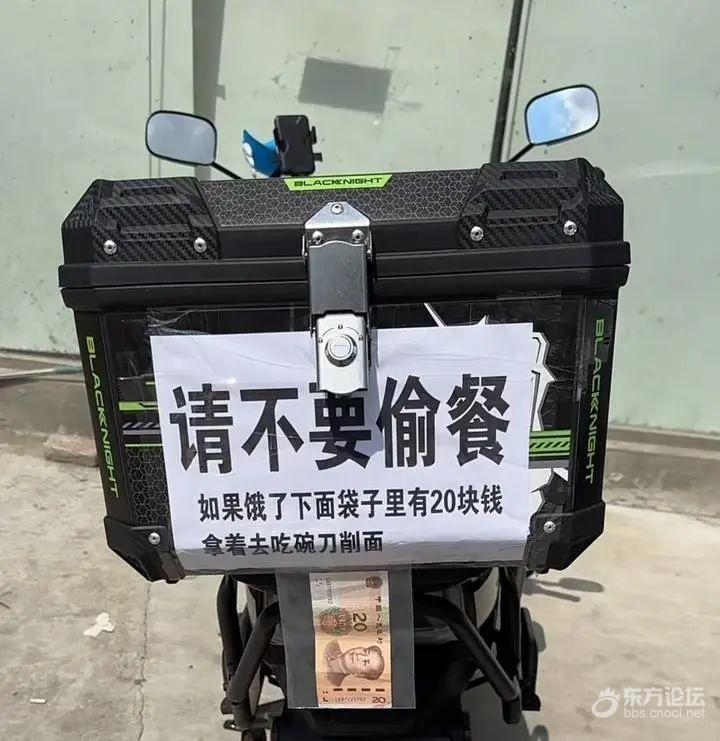 近日,多个网络视频显示,一辆外卖电动车后座挂着20元钱,还贴了一张打印纸,上面写着“请不要偷餐”,提示如果饿了可以拿走20元钱买碗刀削面。8月22日,极目新闻记者联系到这位外卖小哥,他称送餐过程中外卖被偷,所以想到这个办法,目前还没有人拿走钱。 这名外卖小哥李先生介绍,他在山西大同送外卖。8月20日,他在送外卖期间,外卖箱子里的一包零食被人偷走,价值60多元。无奈之下,他跟客户沟通,平台赔付了一部分钱,自己自掏腰包赔了30多元钱。 ![]() 外卖小哥的提示(受访者供图) 当天下午,他就用密封袋装了一张20元钱的纸币,挂在电动车后面,并打印了一张纸,写上“请不要偷餐,如果饿了,下面袋子里有20元钱,拿着去吃碗刀削面”,贴在后座上。 “山西到处都是刀削面,买一碗面,加鸡蛋、烤肠、豆腐、汽水,20元钱基本上够了。”李先生说,他送外卖不到4个月,每天9点开始,一直送到晚上12点左右,已经比较辛苦,如果外卖丢了,处理起来很麻烦,他这样做只是希望个别人不要偷外卖,拿走20元钱都无所谓。 很多网友在视频下方吐槽外卖被偷的经历,分享如何快速处理外卖丢失的流程,并支招如何尽量减少外卖员的损失。还有网友告诉极目新闻记者,自己在大同市星云国际揽御附近看到过这辆电动车,看到时钱还在车后座。 外卖小哥李先生说,目前还没有人拿走这20元钱,这三天外卖也没有再丢,晚上收工以后他会把钱取走,第二天送外卖时再挂上。 |