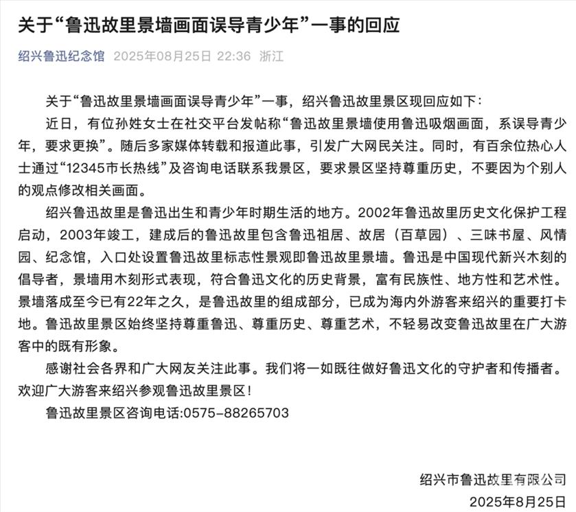 ![]() 8月25日,绍兴市文旅局的一名工作人员表示,他们收到了来自全国各地的电话,“都表示这是历史的客观现实,而且也是绍兴鲁迅故里旅游的一张名片,要求不能因为一个人的投诉盲目做出决策。”大家一致认为不需要修改,文旅局也会在广泛听取民意的基础上做出决策,不会因为一个人的投诉而盲目更换,“是否修改目前还没有通知,会在全面统筹后再做出决策。” 25日晚间,“绍兴鲁迅纪念馆”微信公众号发布关于“鲁迅故里景墙画面误导青少年”一事的回应。 回应称,近日,有位孙姓女士在社交平台发帖称“鲁迅故里景墙使用鲁迅吸烟画面,系误导青少年,要求更换”。随后多家媒体转载和报道此事,引发广大网民关注。同时,有百余位热心人士通过“12345市长热线”及咨询电话联系景区,要求景区坚持尊重历史,不要因为个别人的观点修改相关画面。 绍兴鲁迅故里是鲁迅出生和青少年时期生活的地方。鲁迅故里景区始终坚持尊重鲁迅、尊重历史、尊重艺术,不轻易改变鲁迅故里在广大游客中的既有形象。 ![]() 浙江鲁迅研究会:明确反对借此形象进行网络炒作 针对鲁迅夹烟墙画被指“可能对青少年产生不良引导”一事,浙江省鲁迅研究会回应,明确反对借此形象进行网络炒作,并从形象真实性、思想内涵与历史价值等角度阐明了立场。 浙江省鲁迅研究会秘书长卓光平在回应中强调,该墙画所呈现的是“生活化的鲁迅”,是受到大众广泛认同和喜爱的形象。“我们不应当将鲁迅过度神圣化、战士化。”卓光平指出,以往鲁迅常以“头发如钢钉、笔如匕首”的战斗姿态出现,而鲁迅夹烟墙画则展现出他贴近普通人的真实一面——“他不是高高在上的符号,而是一位有日常习惯的真实人物,这样的形象更显亲切,也符合大众对‘生活化鲁迅’的认知”。 浙江省鲁迅研究会对当前网络上借“鲁迅吸烟”话题进行炒作的行为表示反对,指出:“部分行为实为利用鲁迅博取流量、制造舆论热点,这并不利于对鲁迅精神的正确传播,不应被鼓励。” 关于墙画是否保留的问题,卓光平强调了其历史与文化价值:“该墙画作为艺术呈现已有数十年历史,是绍兴鲁迅故里的标志性场景之一,也是许多游客前来参观留念的重要地点,承载了几代人的共同记忆。若仅因一个动作引发争议就予以拆除,既是对历史的不尊重,也是对艺术作品的不包容,相信大多数人难以认同。” |