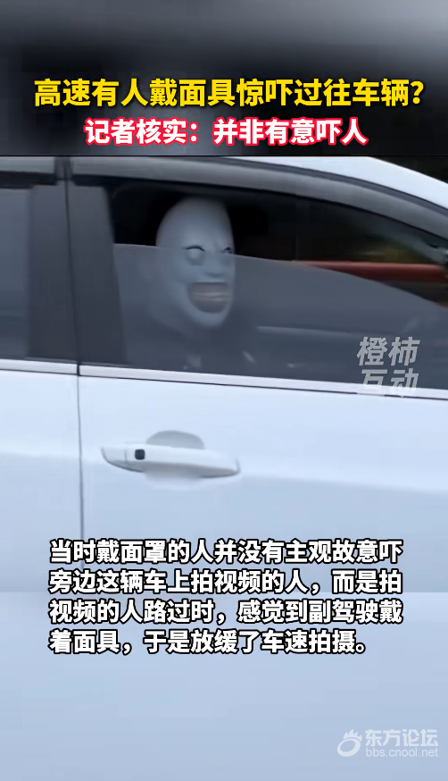 近日,有网友称在长深高速有人戴恐怖面具故意惊吓过路车辆,引发网友热议。 网传视频显示,当时两辆车同向行驶,其中另一辆车副驾驶上突然出现戴面具的人,当时,戴面具的人开着车窗微微起身看向过往车辆,然后将车窗全部摇下又转头注视。 橙柿互动从知情人士处了解到,事发路段是杭新景高速杭州某路段,当时事发过程中,副驾驶上戴面具的人并非故意摇下车窗吓唬路过的其他车辆。 当时戴面罩的人并没有主观故意吓旁边这辆车上拍视频的人,而是拍视频的人路过时,看到副驾驶这个人戴着面具,于是放缓了车速,等戴面具的车辆上来后,他摇下车窗去拍人家的,副驾驶上戴面具的那个人感觉有人在拍他,所以他这才把车窗摇下来。 “当时这个人车上的面具是为节日准备的,对方只是觉得好玩戴在头上,拍视频之前也一直戴着的,结果拍视频的这辆车来了,紧接着他就摇下车窗看看对方是不是在拍他,而不是主观去吓唬别人。” 目前,具体情况还在进一步了解中。 |