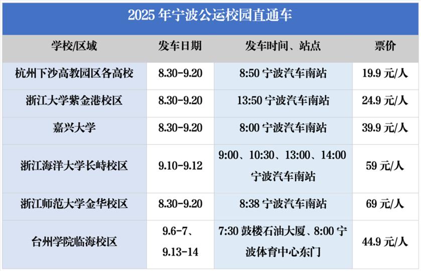 汽车南站班线车。佘若凡/摄 继宁波到周边城市的“景区直通车”之后 为了便利高校学生返校 8月30日起 宁波公运集团将开通“校园直通车” 从宁波出发 直接将学生、家长送到校门口 此次将开通杭州、嘉兴、金华、 台州、舟山等高校校门口 最低单程19.9元 ↓↓↓ 其中,杭州下沙高教园区高校包括浙江财经大学、杭州电子科技大学、浙江理工大学、中国计量大学、浙江传媒学院等。 有出行需求的学子及家人可通过“宁波公运”微信服务号的“校园直通车”板块查询更多信息。 ![]() 此外,“景区直通车”继续上新,在苏州方向,继拙政园线路基础上,这个周末起将新开通同里古镇、周庄2条热门线路,每周六、日运营: 宁波体育中心7:15或鼓楼石油大厦7:35发车,车程约2.5小时到达同里古镇旅游区镇北停车场,17:10返程,单程票价79元,往返套票99元; 宁波体育中心7:20或鼓楼石油大厦7:40发车,车程约3小时到达周庄古镇停车场,16:40返程,单程票价79元,往返套票99元。 感兴趣的市民可通过“宁波公运”微信服务号的“景区直通车”板块查询详细信息,按需规划出行。 |