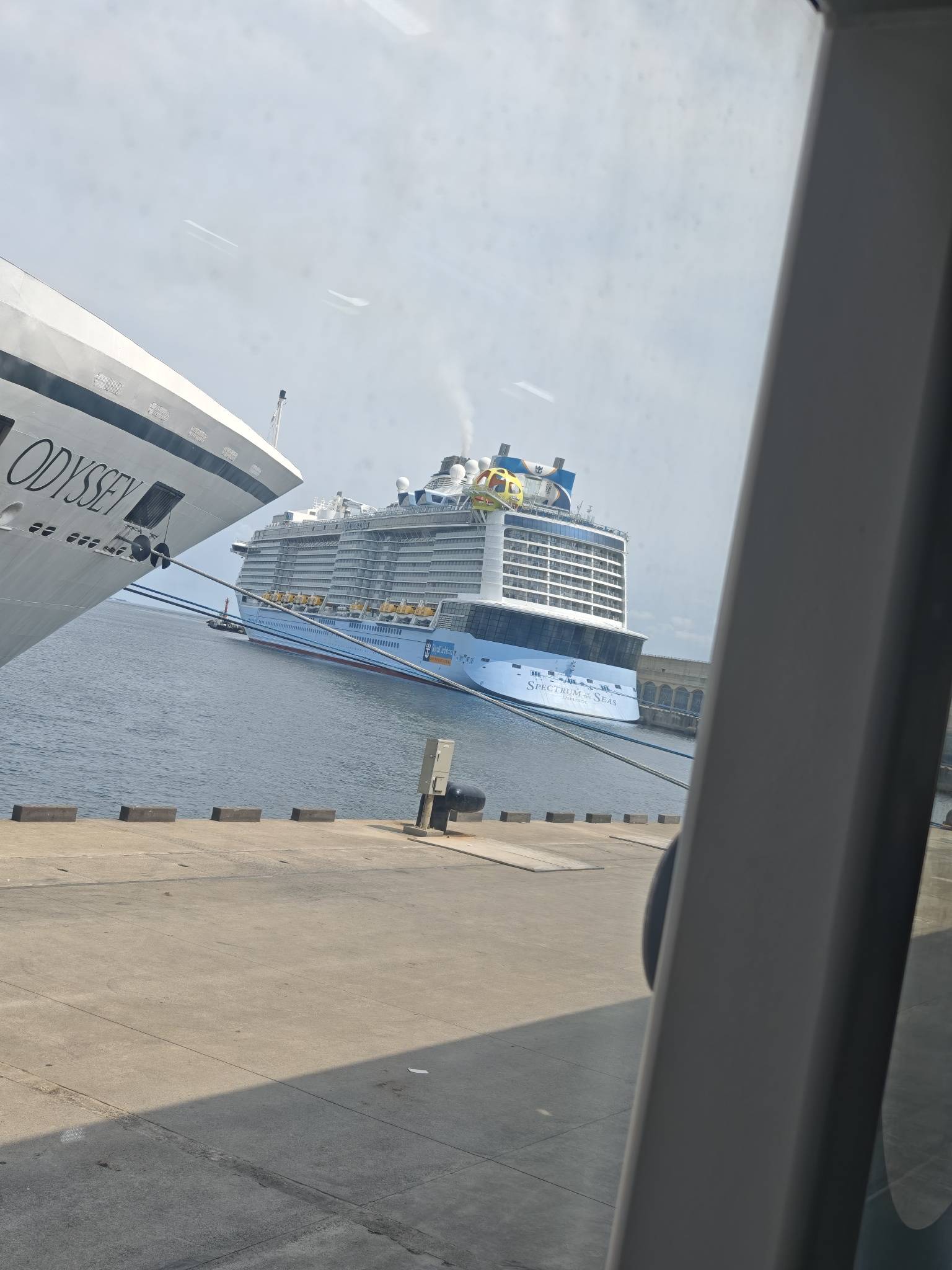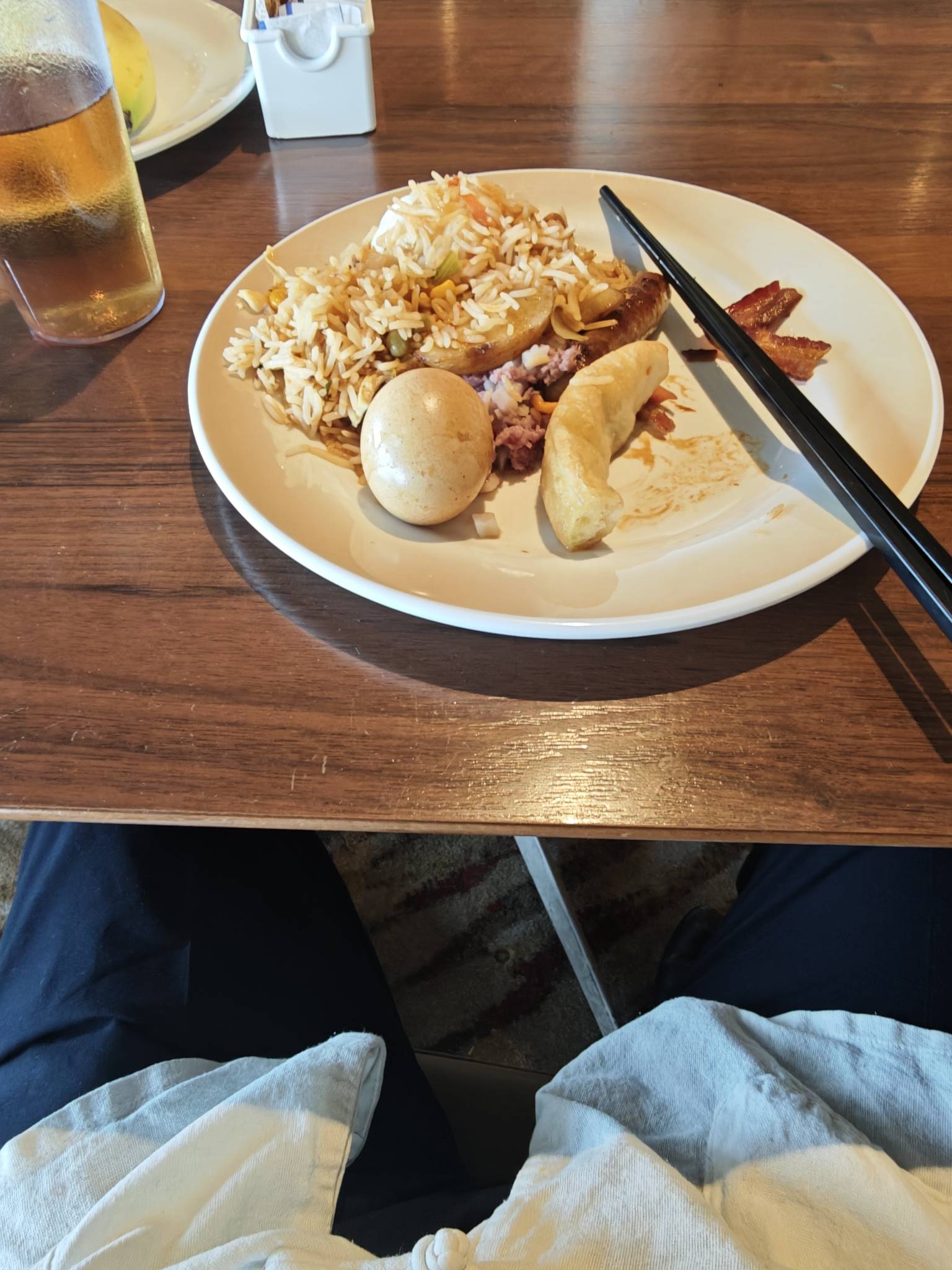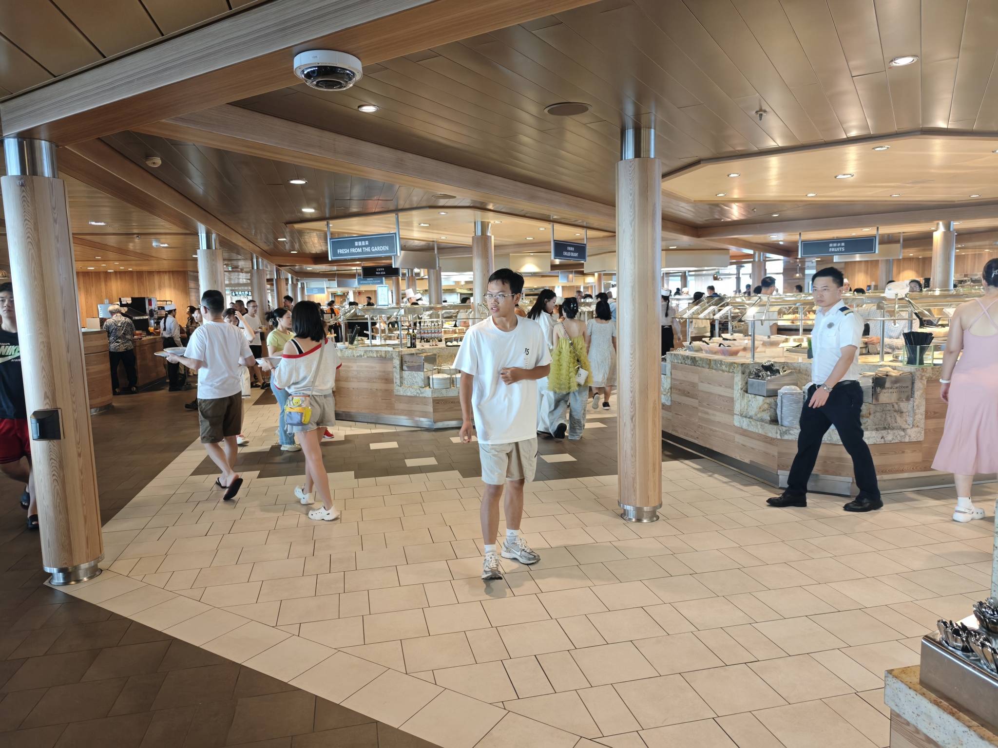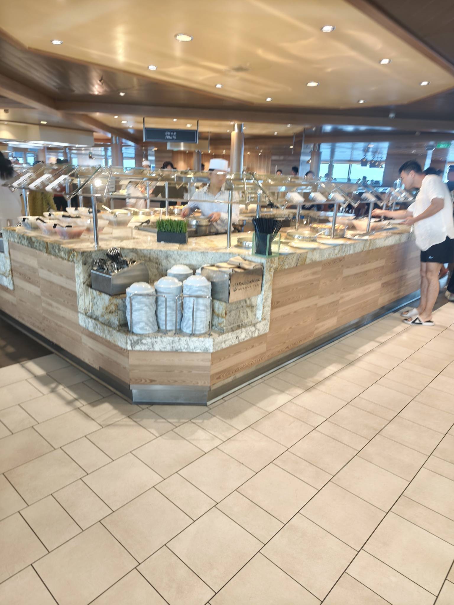 第二天醒来,船上时间调整到了韩国首尔时,再去主餐厅吃早餐,简直是噩梦,三明治硬的咬不动。不过没事,直接上14楼的帆船餐厅吃自助餐,也是免费,这帆船餐厅也是很大,有100多自助菜品和水果、饮料,特别是还有兰州拉面(第一感觉吃的好香)。