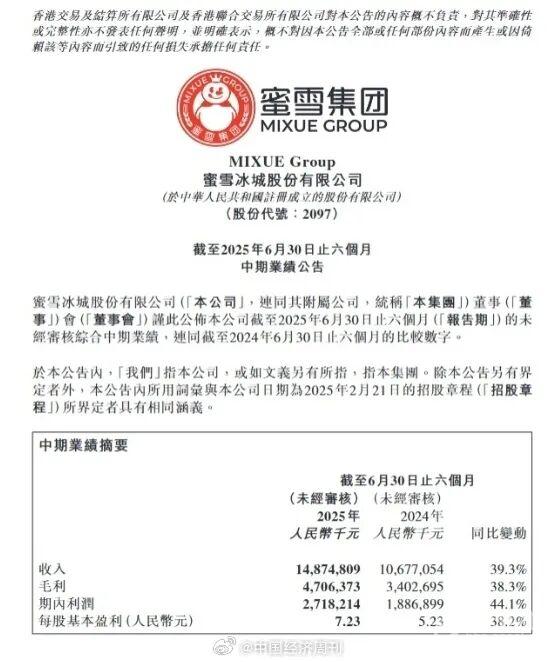 9月2日,据中国经济周刊消息,近日,蜜雪集团发布中期业绩公告:上半年收入为148.7亿元,同比增长39.3%;净利润为27.18亿元,同比增长44.1%。 ![]() 古茗、茶百道、奈雪的茶、沪上阿姨其他四家在港上市茶饮股也于近期披露了2025年中期业绩报告。数据显示,蜜雪冰城以27亿净利润断层领跑。 ![]() 蜜雪冰城(MIXUE Ice Cream & Tea),是一家全国连锁冰淇淋与茶饮的品牌,隶属于蜜雪冰城股份有限公司,截至2024年12月31日,蜜雪冰城拥有46479家门店。 |