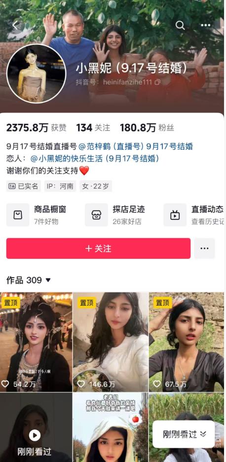 小黑妮本名范梓鹤,是被河南夫妇从巴基斯坦收养的孤儿,因异域面孔与地道河南话的反差而走红,被称为“河南人自己的埃及艳后”。截至目前,小黑妮账号拥有180.8万粉丝,作品获赞2375.8万。她在视频中表示,以后都是真正的河南媳妇了,俩人是在抖音认识的,男友一直默默支持她的自媒体事业,从扛设备到剪辑陪伴左右。会带着“小黑妮”的爸妈一起出去旅游,“小黑妮”爸腰间盘突出干不了重活,男友也二话不说就开车来家干活,为其减轻负担。