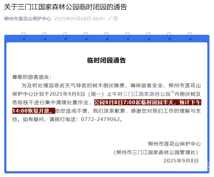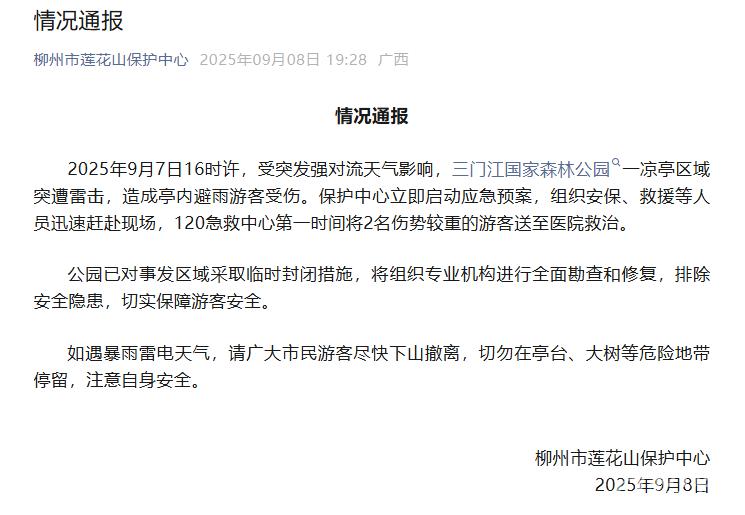 9月7日,有网友称广西柳州市三门江国家森林公园发生雷击事件,多名游客受伤。9月8日,柳州市莲花山保护中心发布情况通报: 9月7日16时许,受突发强对流天气影响,三门江国家森林公园一凉亭区域突遭雷击,造成亭内避雨游客受伤。保护中心立即启动应急预案,组织安保、救援等人员迅速赶赴现场,120急救中心第一时间将2名伤势较重的游客送至医院救治。 公园已对事发区域采取临时封闭措施,将组织专业机构进行全面勘查和修复,排除安全隐患,切实保障游客安全。 如遇暴雨雷电天气,请广大市民游客尽快下山撤离,切勿在亭台、大树等危险地带停留,注意自身安全。 ![]() 8日,该公园曾集中清理倒伏树木 此前,9月8日6时许,柳州市莲花山保护中心(柳州市三门江国家森林公园管理处)发布临时闭园通告称,为及时处理因恶劣天气导致的树木倒伏隐患,确保游客安全,柳州市莲花山保护中心计划于9月8日(周一)上午,对三门江国家森林公园内倒伏树及危险枝干进行集中清理处置作业,公园9月8日7时起临时闭园半天,预计14时恢复开放。 ![]() |