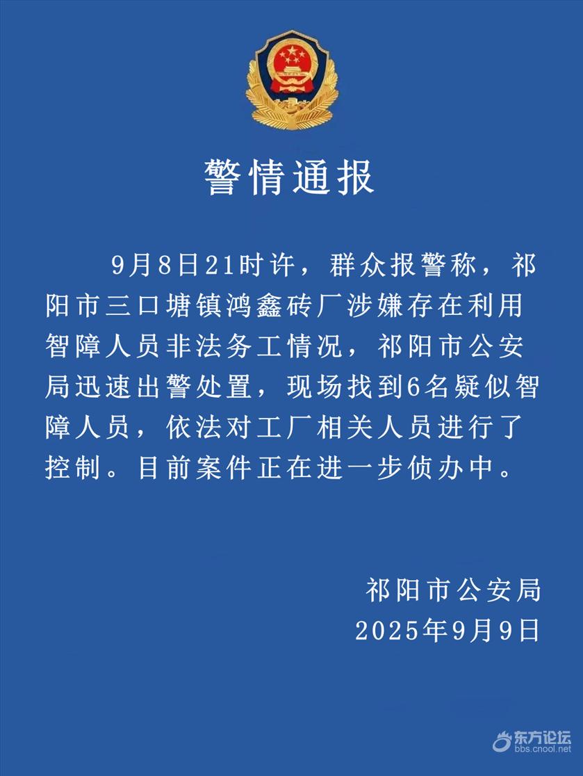 9月8日21时许,群众报警称,祁阳市三口塘镇鸿鑫砖厂涉嫌存在利用智障人员非法务工情况,祁阳市公安局迅速出警处置,现场找到6名疑似智障人员,依法对工厂相关人员进行了控制。