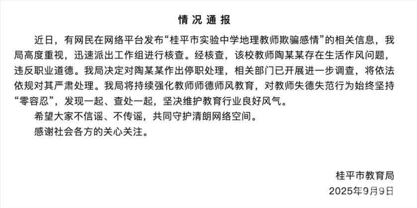 9月9日,广西桂平市教育局发布情况通报称,近日,有网民在网络平台发布“桂平市实验中学地理教师欺骗感情”的相关信息,桂平市教育局局高度重视,迅速派出工作组进行核查。
