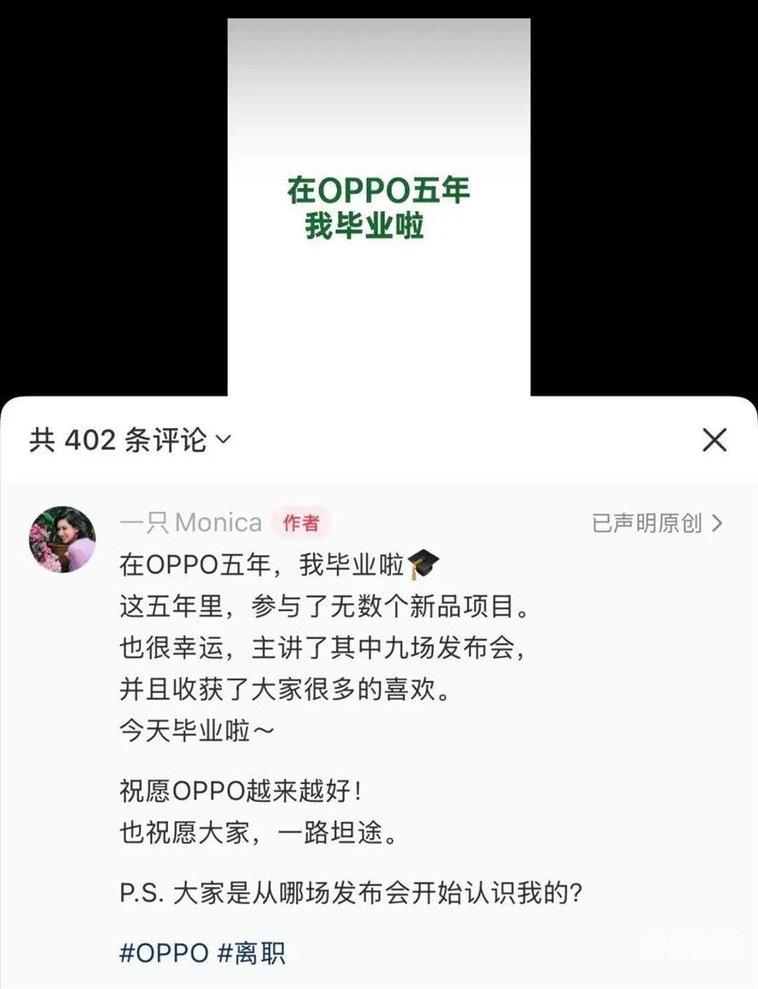 9月8日,OPPO产品经理Monica在人社交平台正式宣布从OPPO离职,其账号简介已更新为“前OPPO打工人”。 ![]() ![]() Monica在OPPO任职的五年期间,曾主导多款热门产品的市场推广与发布策略,并亲自主讲了九场重大新品发布会,被网友称为“OPPO最美产品经理”。 ![]() 去年4月的OPPO K12新品发布会上,Monica以一袭利落西装搭配高跟鞋登场。在介绍手机耐用性时,她以高跟鞋用力踩踏手机这样直观且极具视觉冲击力的方式,展现该机型超强的抗压与防弯折能力,这一名场面迅速出圈。 ![]() 今年2月,在Find N5的技术沟通会上,她亲自坐上由四台手机铰链悬挂的秋千上进行“荡秋千测试”,这一举动不仅生动展示了钛合金铰链的惊人强度,也让她“硬核产品验证”的个人标签深入人心。 ![]() 目前,Monica未明确公开下一步职业规划,但表示祝愿OPPO越来越好。 |