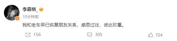 9月11日,歌手李嘉格官宣与导演车澈离婚:“我和老车早已恢复朋友关系,感恩过往,彼此珍重。” 车澈也在朋友圈发文:“我和格格早已恢复朋友关系,感恩过往,彼此珍重。” ![]() ![]() ![]() ![]() 此前,李嘉格曾多次公开谈论过和车澈的婚姻状况。在综艺《是女儿是妈妈》第二季中,李嘉格因为婚姻问题和妈妈爆发过多次争吵。李嘉格曾哭诉说,“我妈妈觉得我不幸福,然后她会一直频繁地提醒我,说你过得不好,你婆婆看不上你,她就没看上咱家,你可得自己争口气。然后我就很苦恼。” 李嘉格妈妈也在节目中透露,跟车澈妈妈见面的头一天,对方就放话说,“这个家做主的是我儿子,你李嘉格不好使,我没看好。”当时自己很生气。 车澈,1984年生于辽宁盘锦,是中国综艺男导演。2005年于东方卫视实习参与《加油!好男儿》,后历经多档综艺制作,2017年凭《中国有嘻哈》声名大噪,此后推出诸多潮流文化节目。 李嘉格,1990年生于辽宁盘锦,毕业于沈阳音乐学院。2014年参加《中国好声音》第三季崭露头角,后续发行专辑、参加综艺。 李嘉格与车澈因《盖世英雄》结缘,二人于2018年11月结婚,育有一子一女。 |