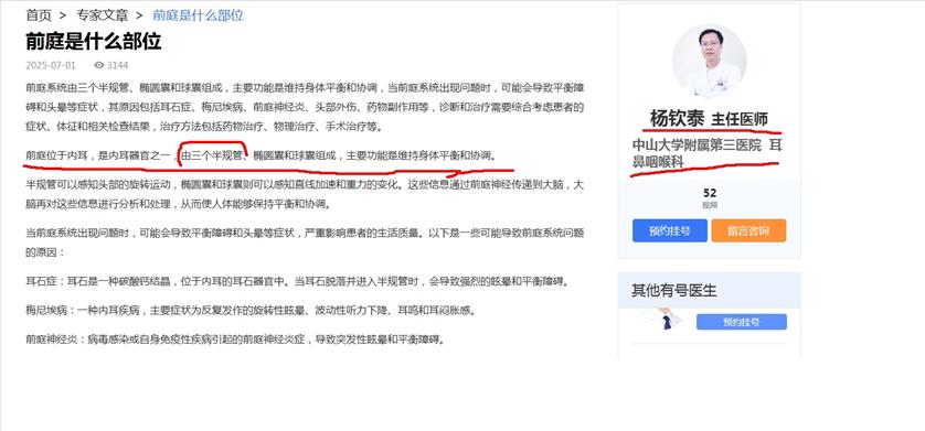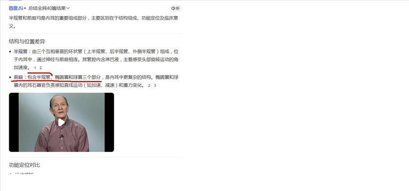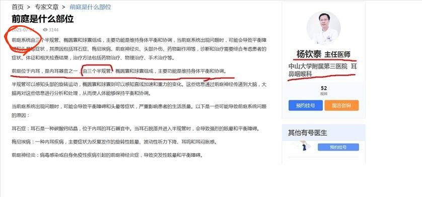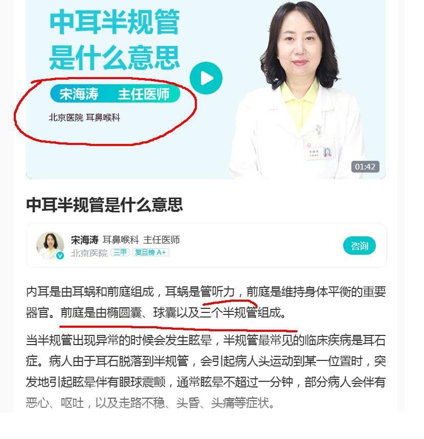 拿个百du内容当权威的,又好气又好笑。能不能看看专业的书本啊,别老是去百du。 这种阿猫阿狗yiliao号,baijia号,百du AI 内容没啥营养的,都是生意。看到“预约挂号”了没?如果你愿意,你也可以花钱占广告位推广,成为专家。 你贴的图里专家文章 开头就说了“前庭系统”,我是从来没听过这种说法的,但这恰恰说明矛盾,一会儿“前庭系统”,一会儿又“前庭”,太矛盾了。 我像你一样去百du一回,结果说“一个人晕车或晕船,就是他的前庭和半规管在起作用”,由此百du内容表明,“前庭”和“半规管”没有从属关系。与你的观点有矛盾呢。同样是百du的内容,你信还是不信? 插图1是你发的,开头所谓“前庭系统” 插图2是我去百du得到的内容之一 插图3是外文教材内容,说前庭位于半规管与耳蜗之间,专业程度远高于百du ![]() ![]() ![]() |