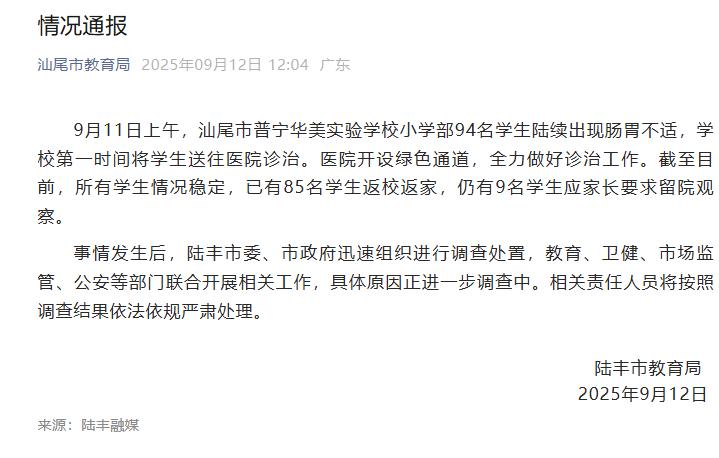 9月11日上午,汕尾市普宁华美实验学校小学部94名学生陆续出现肠胃不适,学校第一时间将学生送往医院诊治。医院开设绿色通道,全力做好诊治工作。