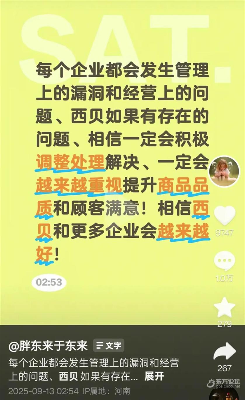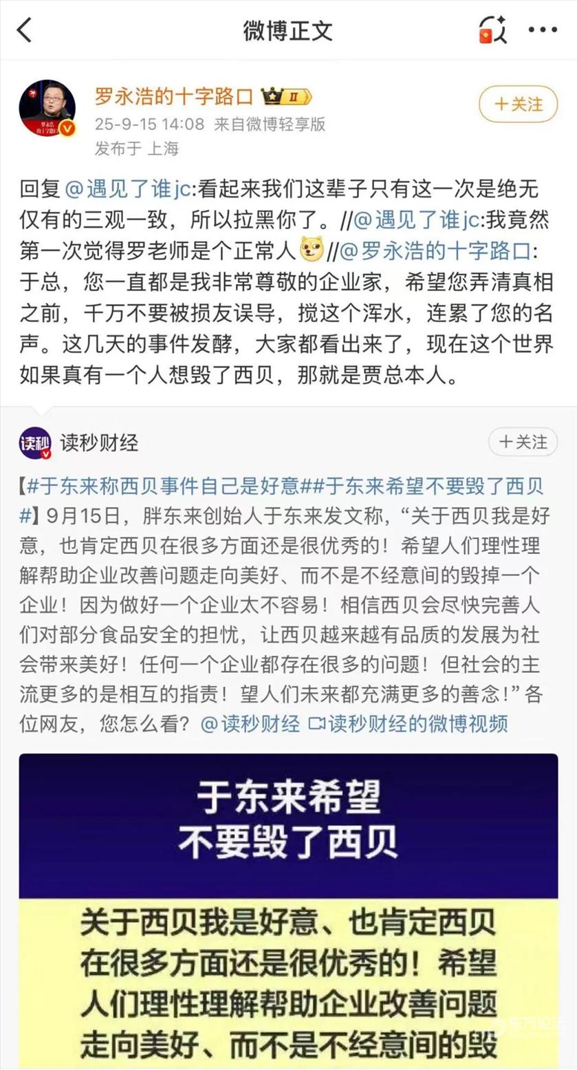 9月15日上午,胖东来集团创始人于东来再次发声,谈餐饮品牌西贝。 于东来个人账号截图 于东来写道:“关于西贝我是好意、也肯定西贝在很多方面还是很优秀的!希望人们理性理解帮助企业改善问题走向美好、而不是不经意间的毁掉一个企业!因为做好一个企业太不容易!相信西贝会尽快完善人们对部分食品安全的担忧、让西贝越来越有品质的发展为社会带来美好!任何一个企业都存在很多的问题!但社会的主流更多是相互的指责!望人们未来都充满更多的善念!” 于东来评论截图 在回复网友评论时,于东来还表示“相信他们(西贝)会改的”。 这并非于东来就“西贝预制菜”风波第一次发声。 早在9月12日舆论发酵后不久,于东来就公开发文称:“任何事没有完美,感谢西贝、海底捞等品牌企业可以让我找到相对放心可口吃饭的地方。” 评论区里,于东来留言道:“因为正义、因为做一个不错的企业、企业家和企业团队付出的心血太不容易了!可建议、可以理解、可以促使企业改进完善,但不能让企业家灰了心!” 于东来个人账号截图 9月13日,于东来再次发文:“每个企业都会发生管理上的漏洞和经营上的问题,西贝如果有存在的问题,相信一定会积极调整处理解决、一定会越来越重视提升商品品质和顾客满意。相信西贝和更多企业会越来越好!” 不过,于东来的言论也引发网友一定的讨论,不少网友表示并不赞同。于东来发文表示:“回到自己的世界吧!享受每一天的美好。”并且,于东来将自己的账号设置为私密,网友需通过对方请求后才能关注并查看内容。这意味着,非粉丝无法看到于东来所发布的言论,包括9月15日他再次发声力挺西贝的内容。 针对于东来的言论,罗永浩9月15日再发声,对于胖东来创始人的于东来对西贝事件的发文,罗永浩称:“于总,您一直都是我非常尊敬的企业家,希望您弄清真相之前,千万不要被损友误导,搅这个浑水,连累了您的名声。这几天的事件发酵,大家都看出来了,现在这个世界如果真有一个人想毁了西贝,那就是贾总本人。” ![]() 来源:极目新闻、潮新闻 |