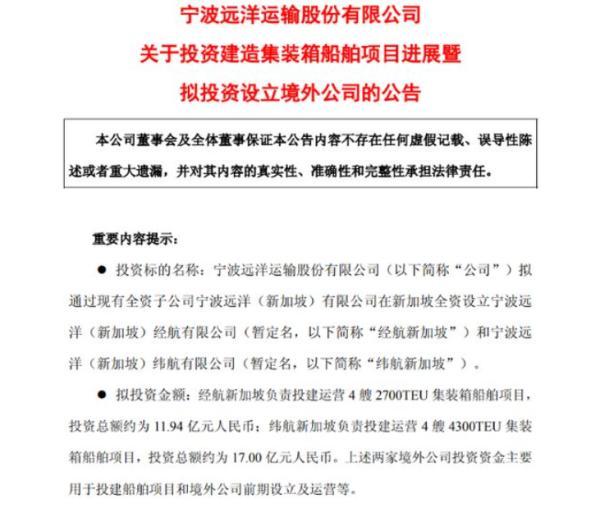 近日,宁波远洋(601022.SH)公告称,公司拟通过全资子公司宁波远洋(新加坡)有限公司在新加坡设立两家境外公司——宁波远洋(新加坡)经航有限公司、宁波远洋(新加坡)纬航有限公司。 上述两家境外公司注册资本均为500万新币。其中,经航新加坡负责投建运营4艘2700TEU集装箱船项目,投资总额约11.94亿元;纬航新加坡负责投建运营4艘4300TEU集装箱船舶项目,投资总额约17.00亿元。总投资约29亿元,资金为自有或自筹资金,主要用于投建船舶项目及境外公司的前期设立与运营。 运力升级 宁波远洋成立于1992年,2022年12月成功登陆沪市主板,是国内首家“A拆A”上市的港航企业。该公司是浙江省内最大的集装箱班轮企业,主营业务为国际、国内沿海和长江航线的航运业务、船舶代理业务及干散货的货运代理业务。 2025年业绩中报显示,宁波远洋已形成一支3000吨级至58000吨级集装箱船舶梯度互补并保有一定数量散货船舶(10艘)的综合性船队。该公司共经营船舶108艘,总运力168.7万载重吨/9.4万载箱量,按载重吨计,运力同比增长12.0%;按载箱量计,运力同比增长16.0%。 ![]() 宁波远洋公告。 新加坡作为全球重要国际航运中心,拥有丰富的航运资源、完善的配套服务及优越的地理区位优势。宁波远洋表示,通过在新加坡设立子公司运营新船,将更高效地对接国际市场,加强与全球航运伙伴的交流合作,推动公司国际竞争力与服务能力的双重提升。 中船黄埔文冲为中国船舶集团属下骨干造船企业,也是我国华南地区最大的船舶建造单位,具有丰富的船舶建造、修理经验,产品质量受到全球船东认可。本次宁波远洋8艘新船均由中船黄埔文冲承建。其中,4艘2700TEU集装箱船计划在2027年至2028年陆续交付;4艘4300TEU集装箱船则将在2029年交付。 值得一提的是,此次宁波远洋订造的4300TEU集装箱船交付后或将成为其自有船队中的最大集装箱船。克拉克森数据显示,目前,宁波远洋船队中最大集装箱船为扬子江船业在2023年至2024年陆续交付的3艘3316TEU船。 航线网络加密 作为全球贸易的命脉与关键环节,航运在现代物流体系中占据不可或缺的地位。而在全球航运市场风云变幻的当下,各大航运企业都在积极谋划战略布局,力求在激烈的竞争中抢占先机。 今年以来,宁波远洋凭借母港宁波舟山港的核心枢纽优势,持续加密已有航线班期,先后开通“宁波—杰贝阿里”“太仓—乍浦—宁波—海防”“宁波—马尼拉”等新航线,逐步形成覆盖全国沿海,远抵日本、韩国、东南亚、中东等地区的航线网络。 ![]() 宁波远洋“新明州90”轮。 值得注意的是,今年3月,宁波远洋首艘“内贸转外贸”集装箱船“新明州90”轮完成首航。根据计划,同型号的“新明州92”轮、“新明州96”轮等5艘集装箱船,也会陆续完成“内贸转外贸”改造,相继投入近洋航线运营。 此外,今年7月,宁波远洋“新明州27”还满载5万余吨钢材、工程机械、设备和车辆成功靠泊尼日利亚拉各斯港阿帕帕港区,正式宣告其首条西非航线进入常态化运营。西非航线也是宁波远洋的第二条外贸散杂货运输航线。2025年上半年,宁波远洋完成散货业务量1458万吨,同比增长4.3%。 宁波远洋表示,伴随件杂货运输业务的常态化运营,公司将不断丰富其航线网络和货物结构,持续拓展其在“一带一路”沿线及非洲市场的战略布局,进一步提升企业全球综合航运服务能力与国际影响力。 不仅如此,今年上半年,宁波远洋还完成4艘绿色智能船舶的交付营运,另有2艘“全球领先、国内首制”的740TEU纯电动敞口集装箱船正按计划有序建造。 另据去年年报,宁波远洋自有船舶中,绿色节能型船舶数量为23艘,占比48.9%;全年成功节约燃油4704吨,减少二氧化碳排放约14648吨;自有船舶共接插岸电3142艘次,同比增长约25.4%;使用岸电减少二氧化碳排放量约1730.2吨,同比增长约104.3%。 |
