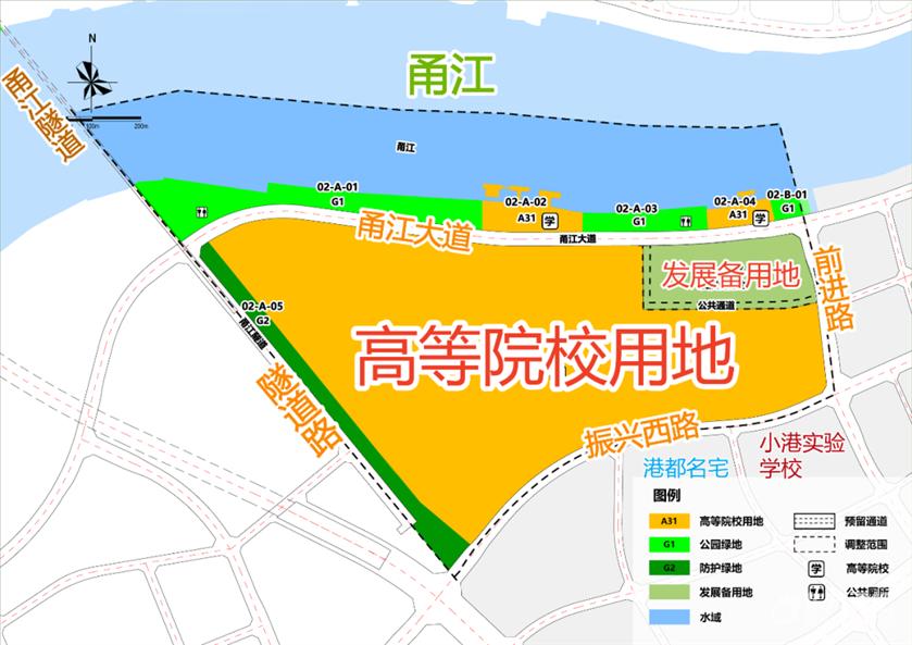 规划调整的主要内容,是拟将区内原规划的行政办公用地、商业商务综合用地以及部分隧道路沿线防护绿地等,均调整为高等院校用地;区块东北角原规划的一宗居住用地,调整为发展备用地进行规划预留。