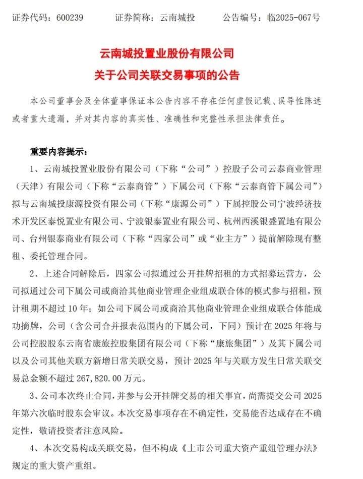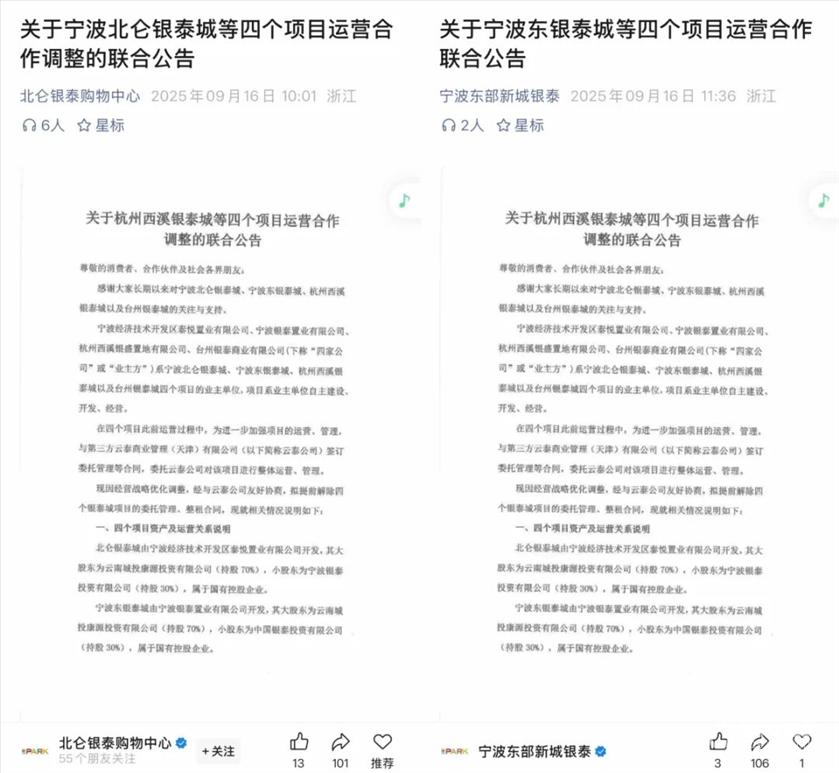 四座银泰城运营方被提前解约 9月16日,宁波东银泰城、宁波北仑银泰城同步发布《关于杭州西溪银泰城等四个项目运营合作调整的联合公告》(以下简称《公告》)。该《公告》署名为云南城投康源投资有限公司浙江管理团队。 《公告》称,宁波经济技术开发区泰悦置业有限公司、宁波银泰置业有限公司、杭州西溪银盛置地有限公司、台州银泰商业有限公司(以下简称“四家公司”或“业主方”)系宁波北仑银泰城、宁波东银泰城、杭州西溪银泰城、台州银泰城四个项目的业主单位,“项目系业主单位自主建设、开发、经营”。 ![]() 宁波两家银泰城发布公告。 随后,《公告》对四个项目资产及运营关系进行了说明。其中—— 北仑银泰城由宁波经济技术开发区泰悦置业有限公司开发,其大股东为云南城投康源投资有限公司(持股70%),小股东为宁波银泰投资有限公司(持股30%),属于国有控股企业; 宁波东银泰城由宁波银泰置业有限公司开发,其大股东为云南城投康源投资有限公司(持股70%),小股东为中国银泰投资有限公司(持股30%),属于国有控股企业。 《公告》称,在四个项目此前运营过程中,与第三方云泰商业管理(天津)有限公司签订委托管理等合同,委托其对上述四个项目进行整体运营、管理。现因经营战略优化调整,拟提前解除四个银泰城项目的委托管理、整租合同。该行为并不会变更上述项目的权属性质。 云泰商业退出运营,但4座银泰城仍照常经营。 上述《公告》称,四个项目当前仍正常营业,餐饮、零售、影院等业态均按原营业时间服务,确保消费者已购权益不受影响。新运营方将签订权益承接协议,将安排专人对接运营调整事宜;对于因调整产生的合同变更需求,将本着“平等协商”原则,与商户共同制定解决方案,最大程度的保障商户经营利益。 这份《公告》实际源于2025年9月10日云南城投置业股份有限公司发布的《关于公司关联交易事项的公告》——控股子公司云泰商业管理(天津)有限公司拟与云南城投康源投资有限公司下属控股公司宁波经济技术开发区泰悦置业有限公司、宁波银泰置业有限公司、杭州西溪银盛置地有限公司、台州银泰商业有限公司提前解除现有整租、委托管理合同。