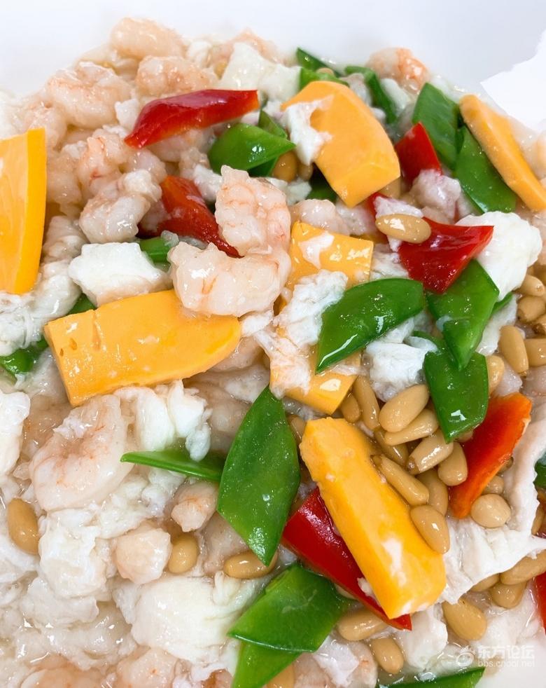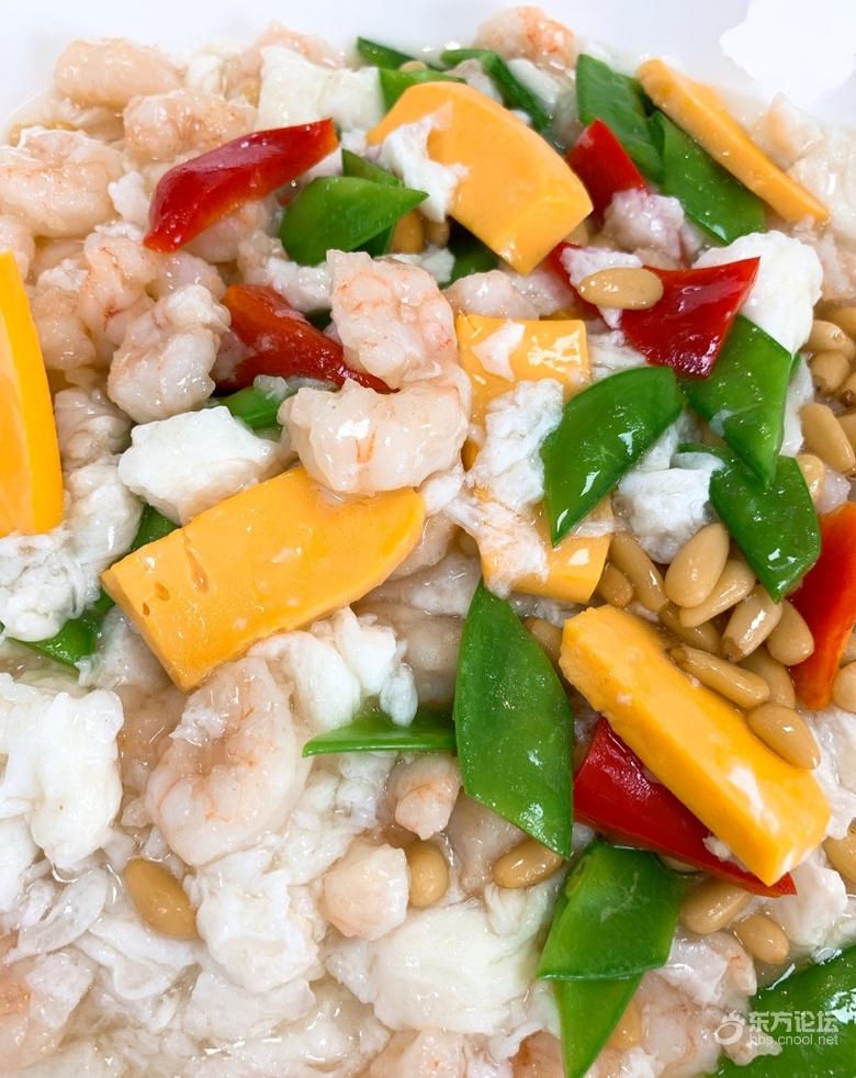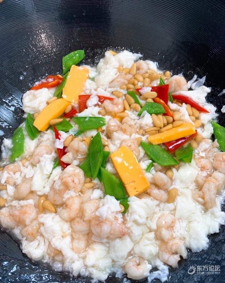 做法:虾仁洗净用厨房纸吸干水分,加盐拌匀,加入鸡蛋清搅拌至均匀地粘在虾仁上,再洒上适量淀粉搅拌均匀,加适量色拉油再次拌匀,盖好保鲜膜放入冰箱冷藏二小时以上。松子下油锅炸熟捞出,腌好的虾仁下油锅滑熟。三只鸡蛋清打匀后放入少许盐、味精、适量清水及淀粉,顺一个方向拌匀。炒锅烧热,放入猪油油温三成热时,端起蛋碗,轻轻撒放油锅四周,边用勺子推划油脂,待其上浮时,捞出沥油。锅上火加入适量清水,烧开后加入少许盐、味精,放入虾仁、芙蓉蛋片、剪豆、红椒片,用水淀粉勾芡,倒入松子,淋上猪油即可出锅装盘。