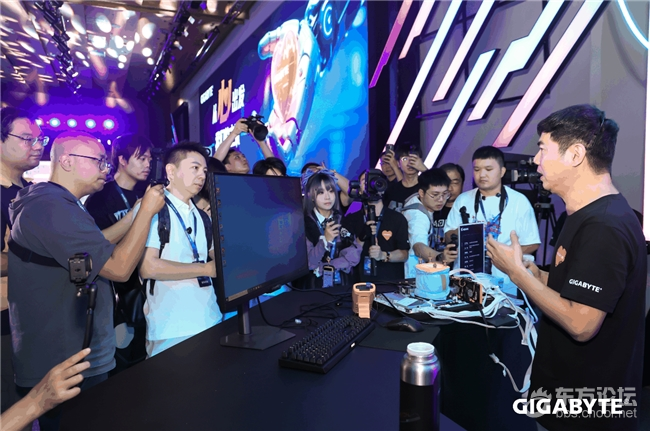 技嘉科技集团总经理 林英宇先生致开场词,并讨论现代社会AI与日常生活的深入联系,技嘉由从此出发从硬件到软件融入,使AI技术为个人用户、企业和内容创作者提供更优质的生产力。 极限超频的“硬核秀场” 多项超频世界纪录保持者“HiCookie”柯智化先生亲临现场,带来液氮极限超频演示。在众多媒体和嘉宾的围观下,技嘉X870 AORUS TACHYON ICE 钛冰雕的频率参数不断突破上限,每一次屏幕上的数值跳动,直观展现了技嘉主板在超频能力、处理器供电稳定性以及硬件兼容性上的顶尖实力。