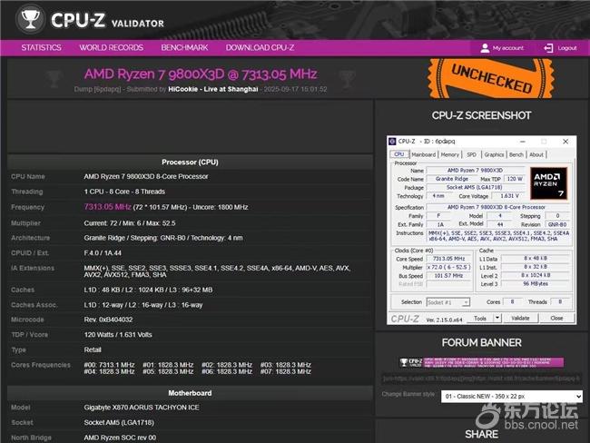 本次2025技嘉发布会同时还创造了一个新纪录:超频大神HiCookie使用9800X3D处理器搭配技嘉X870 AORUS TACHYON ICE钛冰雕主板使用液氮超频完成了7.3GHz超频的挑战,并通过了CPU-Z的认证。