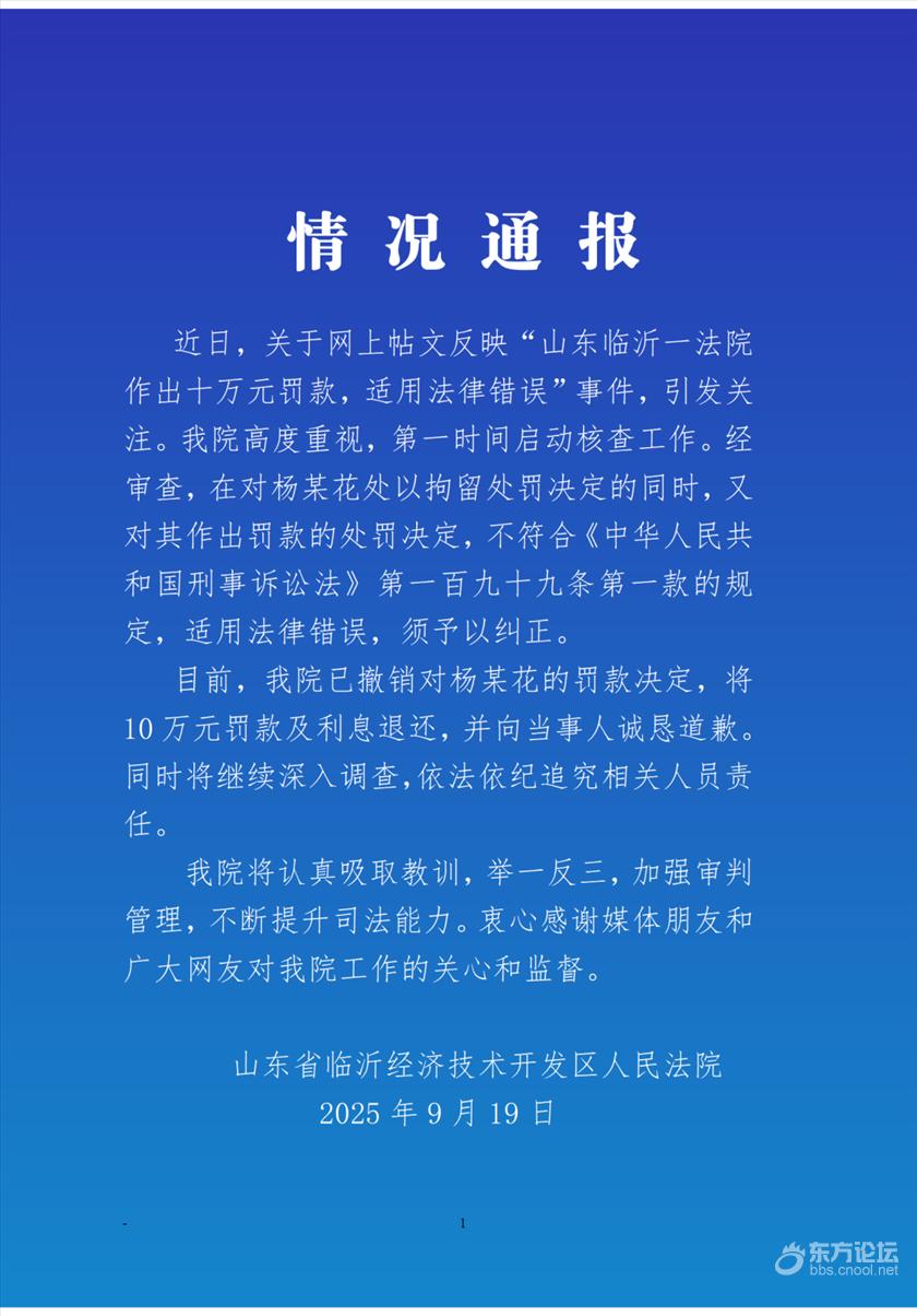 9月19日,山东省临沂经济技术开发区人民法院发布情况通报:近日,关于网上帖文反映“山东临沂一法院作出十万元罚款,适用法律错误”事件,引发关注。我院高度重视,第一时间启动核查工作。经审查,在对杨某花处以拘留处罚决定的同时,又对其作出罚款的处罚决定,不符合《中华人民共和国刑事诉讼法》第一百九十九条第一款的规定,适用法律错误,须予以纠正。 目前,我院已撤销对杨某花的罚款决定,将10万元罚款及利息退还,并向当事人诚恳道歉。同时将继续深入调查,依法依纪追究相关人员责任。 ![]() 此前报道 2023年,杨某花的丈夫王某与同村村民孙某因拆迁楼房分配问题发生纠纷。该房屋由孙某缴纳楼房款,但一直由王某一家换锁居住,孙某多次要求其搬离未果。2023年10月,两家人互殴,王某被对方手持羊角锤打伤,伤情鉴定为轻伤二级。今年6月,临沂经开区法院一审判处孙某拘役三个月,赔偿杨某花丈夫各项损失共计25390.69元。 杨某花认为判罚过轻,前往法院执行大厅找法官理论,与法官发生言语冲突。她承认自己情绪激动、嗓门大,说了句“谁这么判决,谁就没有良心”,但否认侮辱、谩骂法官。该法院决定对杨某花罚款10万元,并处15日拘留。 9月18日,临沂市中级人民法院周副院长告诉记者,临沂成立了工作专班,中院也已责成临沂经开区法院尽快调查处理。“我们中院的态度是有错必纠,绝不讳疾忌医。为了处理好此事,我们还请示了省高院。” 山东省高院新闻发言人也表示,省高院已经关注到此事,“一定会依法处理”。 |