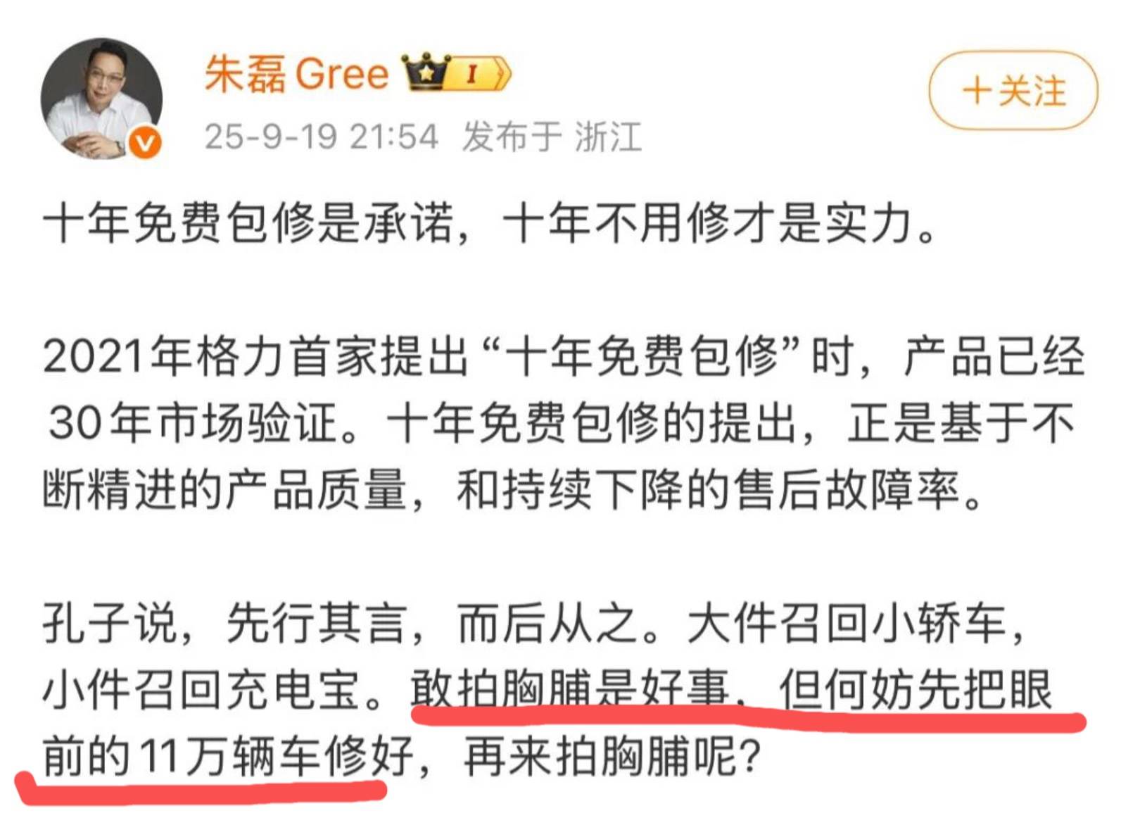对此,格力市场总监朱磊发文称:“十年免费包修是承诺,十年不用修才是实力”。他表示,2021年格力首家提出“十年免费包修”时,产品已经30年市场验证。十年免费包修的提出,正是基于不断精进的产品质量,和持续下降的售后故障率。“孔子说,先行其言,而后从之。大件召回小轿车,小件召回充电宝。敢拍胸脯是好事,但何妨先把眼前的11万辆车修好,再来拍胸脯呢?”