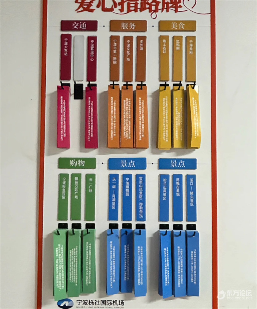 去宁波机场接朋友,看到了这一墙的爱心指路牌,涵盖了交通、服务、美食、购物和景点,对于刚来宁波旅游的游客来说,这真的看得清清楚楚,太贴心了。