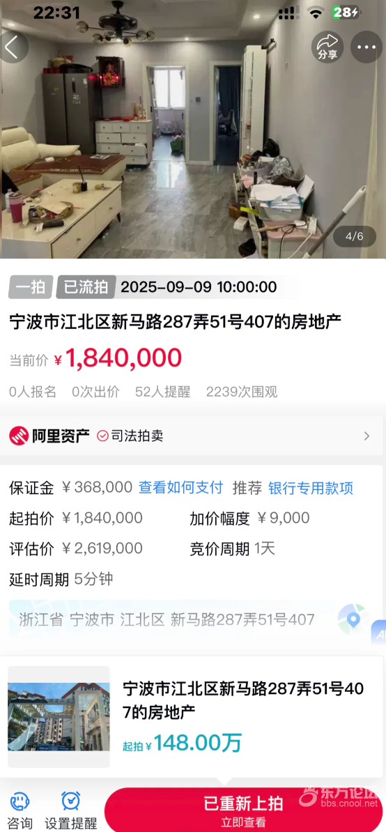 在法拍里面看到的,江北区中马街道的新马小区 51 号,面积97.83平,6楼里面的4楼,为什么强调 51 号呢,因为这一幢当时涉及到通途路的扩宽,白话点就是拆迁, 2024 年 11 月 1 号 第一次上拍,因为有规划预期 2024年12月3号,5个人报名,经过73次激烈角逐,最终拍到313.6万,平均3.2,超出评估价261万整整52万, 但 2025年8月6号又再次184万上拍,平均1.88。出乎意料的是 2025年9月9号184万流拍, 2025年9月11号二拍148万出来了,平均1.51,29号即将开拍,大家觉得这套房子会不会流拍? 有2个疑惑点:1、大半年过去了,为什么评估价没变? 2、产证所有人还是原先第一任房东? |