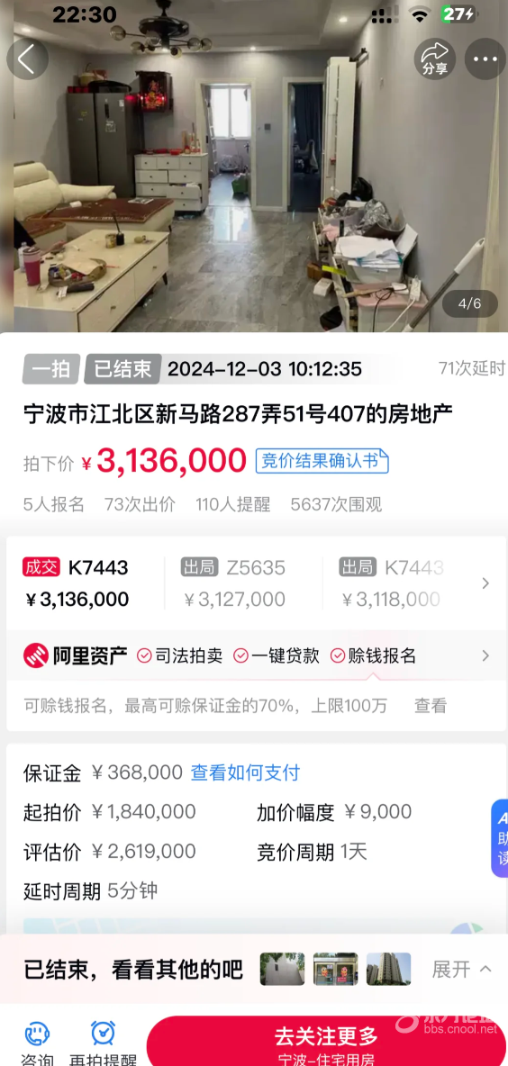 1.第一次24.12月184W起拍,当时可能有拆迁预期,结果竞争对手太多,买家上头了,一直拍到313万。拍了之后肯定后悔了啊。宁可36万保证金不要了,也比313万买下来当冤大头的强,不然要损失至少150万。 2.然后25.9.9日还是184W起拍,又重新开拍,估计没拆迁预期了,没人拍,结果流拍了。 3.流拍之后,再次拍要在上次起拍价的基础上打八折,也就是184*0.8=148万,25.9.29再次148W的起拍价再次拍卖。 总结:有没有拖,商拍的不好说,可能会有内部的托。但是法拍的基本上不会有拖,上头了悔拍的也很正常的。如果当托,我想这个风险也太大了,你出价了没人接棒,那自己就得接手,不接手悔拍,那保证金可就没了,这托当的风险太大。 |