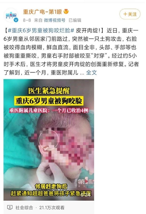 近日,重庆一6岁男童从邻居家门前路过,突然被一只土狗攻击,右脸被咬得血肉模糊,鲜血直流,面目全非,头部、手部等也被狗重重撕咬,男童右手肘部被咬至“对穿”。经过约5小时手术后,医生才将男童皮开肉绽的创面重新修复。记者了解到,近一个月,重医附属儿童医院已收治4例被狗咬伤儿童。医生提醒天气炎热警惕动物狂躁伤人。 事实有的狗和小孩混养是有风险的,存有几张图,想想不发了,全都是小孩子被咬死的尸检照片,有个三周大的小孩脑袋被一只大型杂交犬从脖子位置咬掉了,在对犬的尸检中从其肠胃中发现了破碎的头骨和软组织。还有一岁半的小孩后脑壳被牛头梗咬开脑组织暴露,脚趾被吞了。6岁小孩的整个脸皮被两条斯塔夫斗牛梗撕下,凄惨无比。
