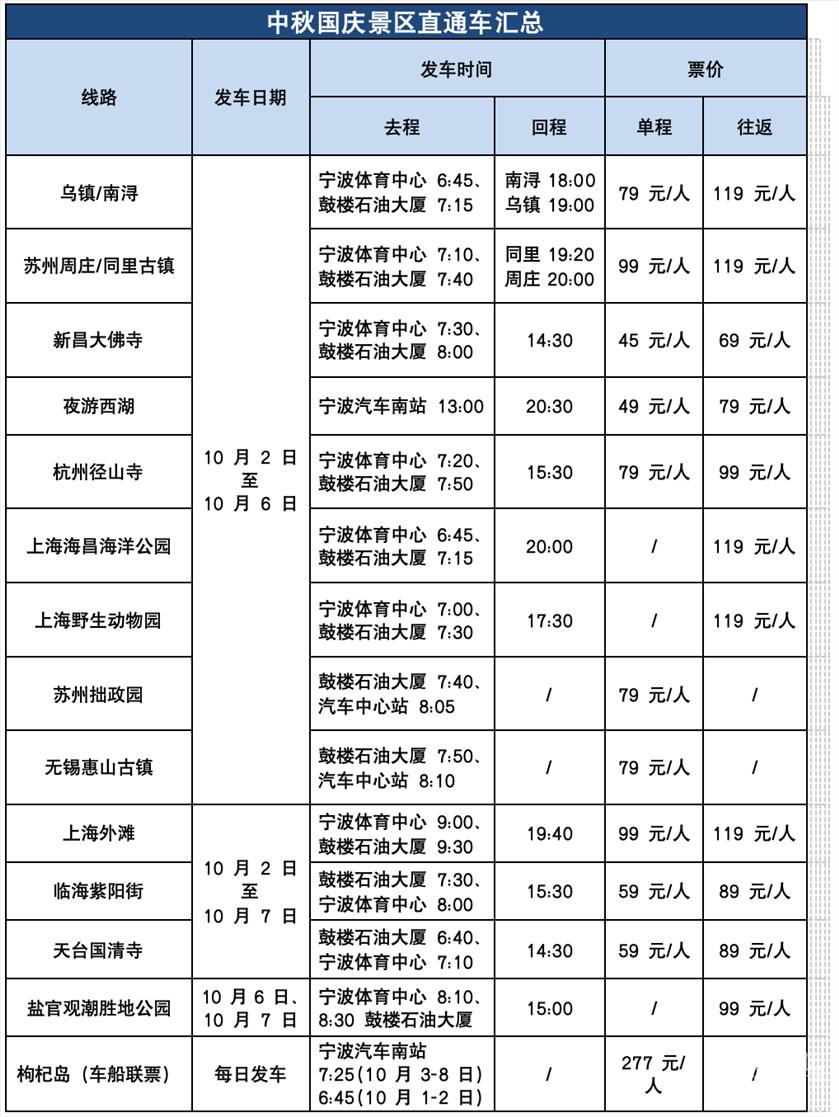 据宁波公运集团消息,节日期间,宁波景区惠民直通车继续开行,不仅涵盖现有的杭州西湖、苏州拙政园、上海外滩、上海海昌海洋公园、上海野生动物园、无锡惠山古镇等知名景区,还新增海宁盐官观潮胜地公园、舟山枸杞岛等热门打卡地,各条线路提供单程和往返不同选择,满足旅客需求。具体如下: ![]() 宁波公运集团相关人士也表示,目前正值假期车票预订高峰,数据显示,国庆期间,上海、杭嘉湖、金丽衢、绍兴、台州、温州、舟山等地相对热门,如果计划往这些方向出行,一定要提前订票。 此外,正值开渔季,国庆期间想托运鲜货给亲朋好友的市民可选择宁波汽车南站、汽车中心站的行包托运服务,苏浙沪范围可实现3小时内到达。 |