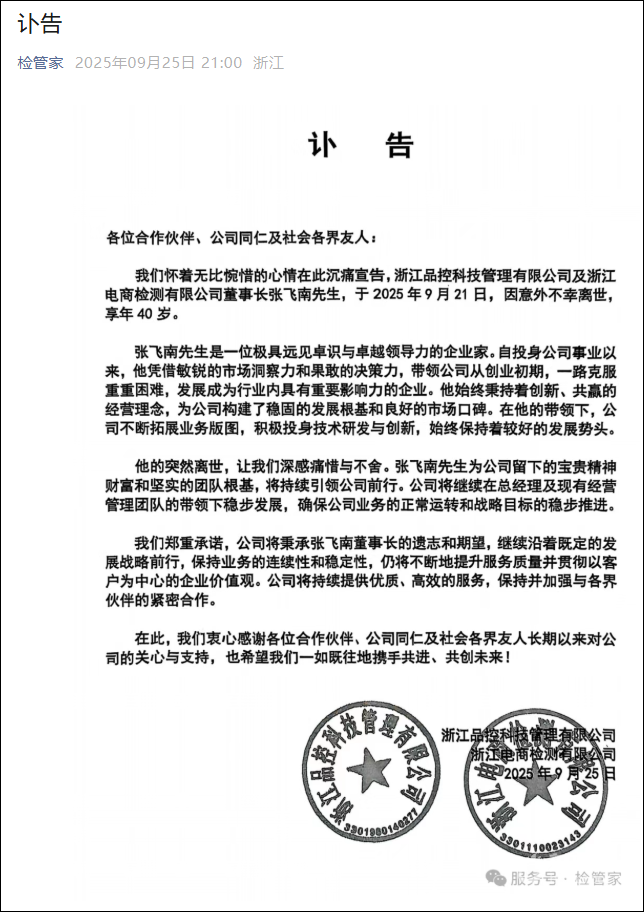 9月25日晚,浙江品控科技管理有限公司发布讣告,宣告公司及浙江电商检测有限公司董事长张飞南于2025年9月21日因意外离世,年仅40岁。 ![]() 讣告称,张飞南先生是一位极具远见卓识与卓越领导力的企业家。自投身公司事业以来,他凭借敏锐的市场洞察力和果敢的决策力,带领公司从创业初期,一路克服重重困难,发展成为行业内具有重要影响力的企业。他始终秉持着创新、共赢的经营理念,为公司构建了稳固的发展根基和良好的市场口碑。 据公开信息,浙江品控科技管理有限公司于2019年12月16日成立,总部在杭州市钱塘新区。法定代表人张飞南,公司经营范围包括:技术开发、技术服务、技术咨询、成果转让:网络信息技术、通信技术、检测技术、计算机软硬件;批发、零售:电子产品、办公用品、计算机软硬件;服务:企业管理咨询,商务信息咨询(以上除商品中介),网页设计,企业营销策划,市场营销策划,会务会展服务等。 浙江电商检测智慧化实验室 浙江电商检测有限公司成立于2018年1月26日,是经国家认证的第三方检测机构,主要从事纺织品、鞋包等产品的理化检测及认证服务。公司总部位于杭州市钱塘区,实验室面积超10000平方米,2023年出具检测报告近60万份,拥有员工近400人,其中检测工程师均通过专业考核。 据极目新闻报道,9月26日,浙江品控科技管理有限公司的员工告诉记者,公司董事长张飞南因意外离世属实,“不方便告知具体情况,他人挺好的。” |