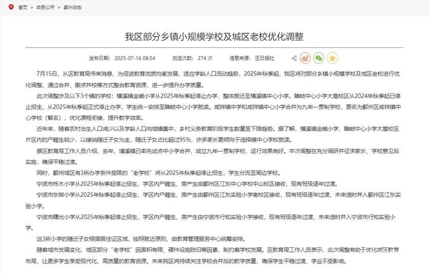 老三区的小型学校会关很多。鄞州区栎木小学、东柳小学等好几家,今年不招新生了,明后年就会关门合并。