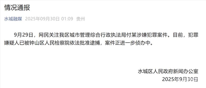 9月29日,网民关注我区城市管理综合行政执法局付某涉嫌犯罪案件。目前,犯罪嫌疑人已被钟山区人民检察院依法批准逮捕,案件正进一步侦办中。