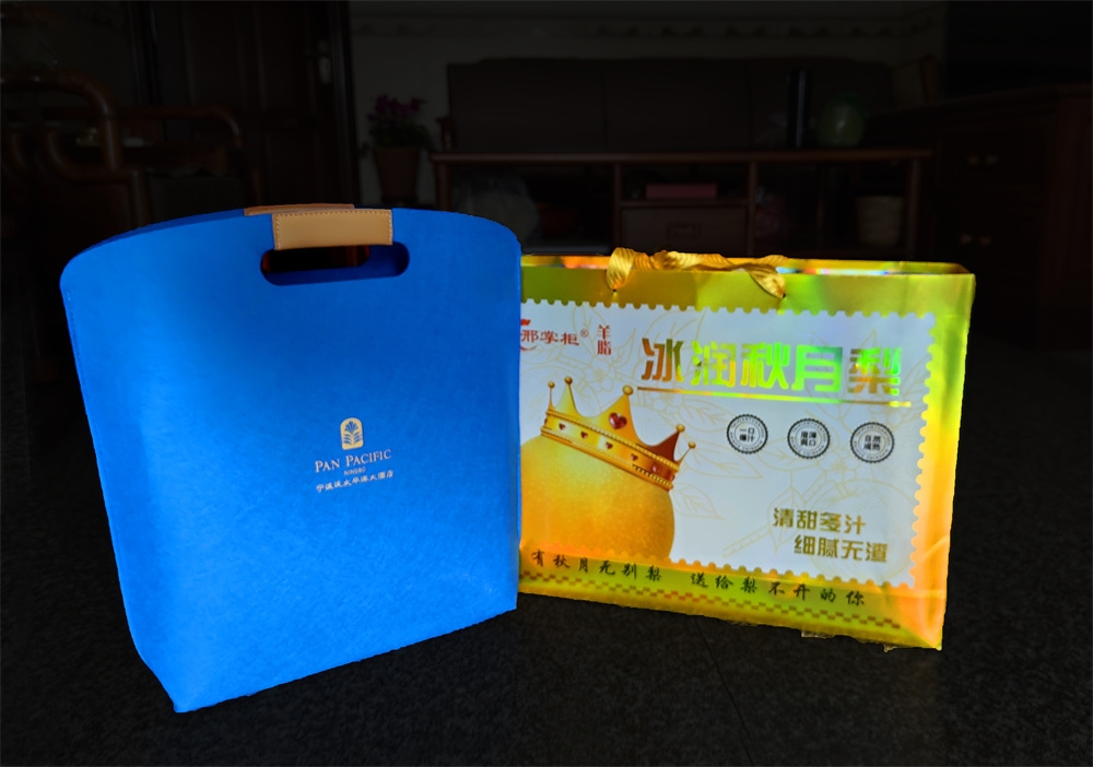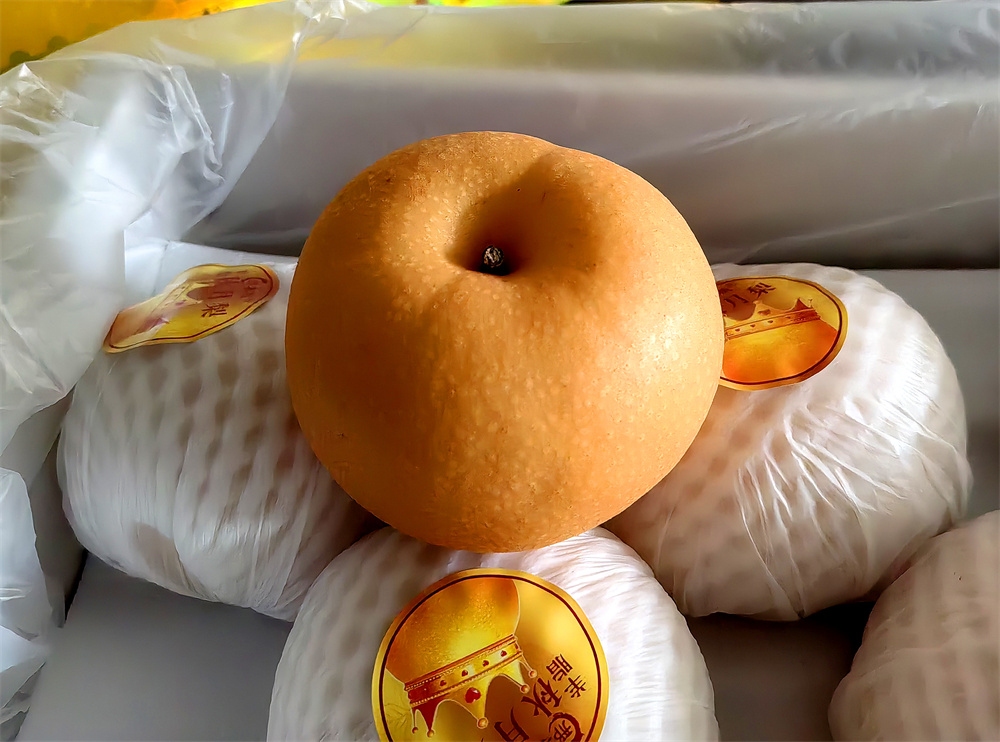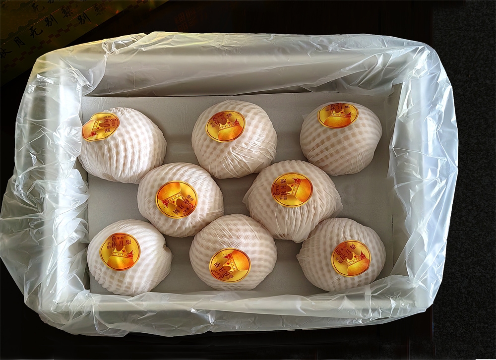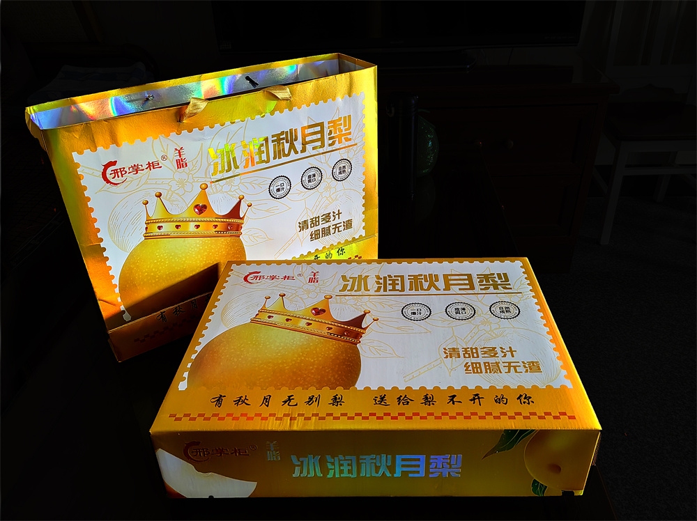 纸袋里有硬纸盒硬纸盒里有塑料膜 8只梨每只梨有软纸包着,贴着商标