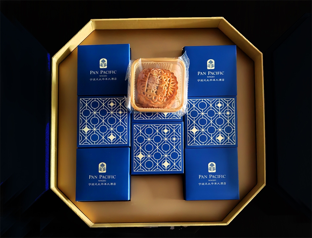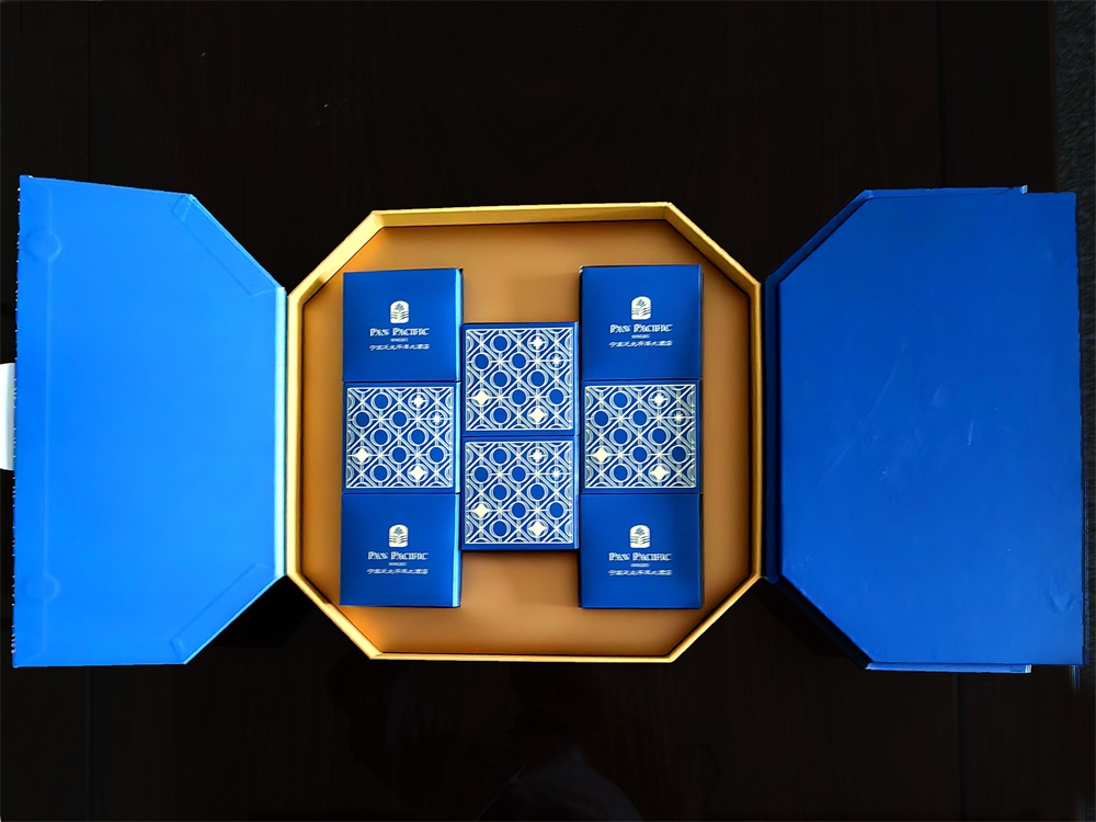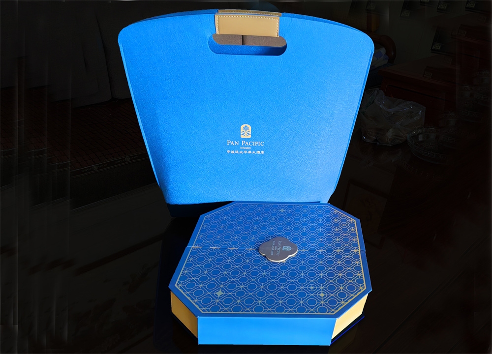 篮色的软包里装的是一盒月饼 月饼的硬纸盒很精致素雅