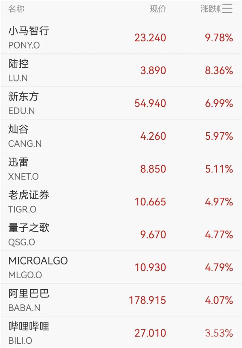 中概股集体上涨,纳斯达克中国金龙指数一度涨超2%,小马智行涨近10%,新东方、迅雷、阿里巴巴等涨超4%。