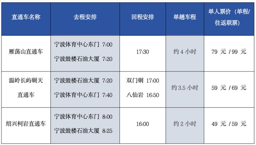 10月3日至7日,宁波景区惠民直通车再推3条新线路,分别直达雁荡山、柯岩和温岭长屿硐天,旅客可通过“宁波公运”微信服务号的“景区直通车”版块查询订票。