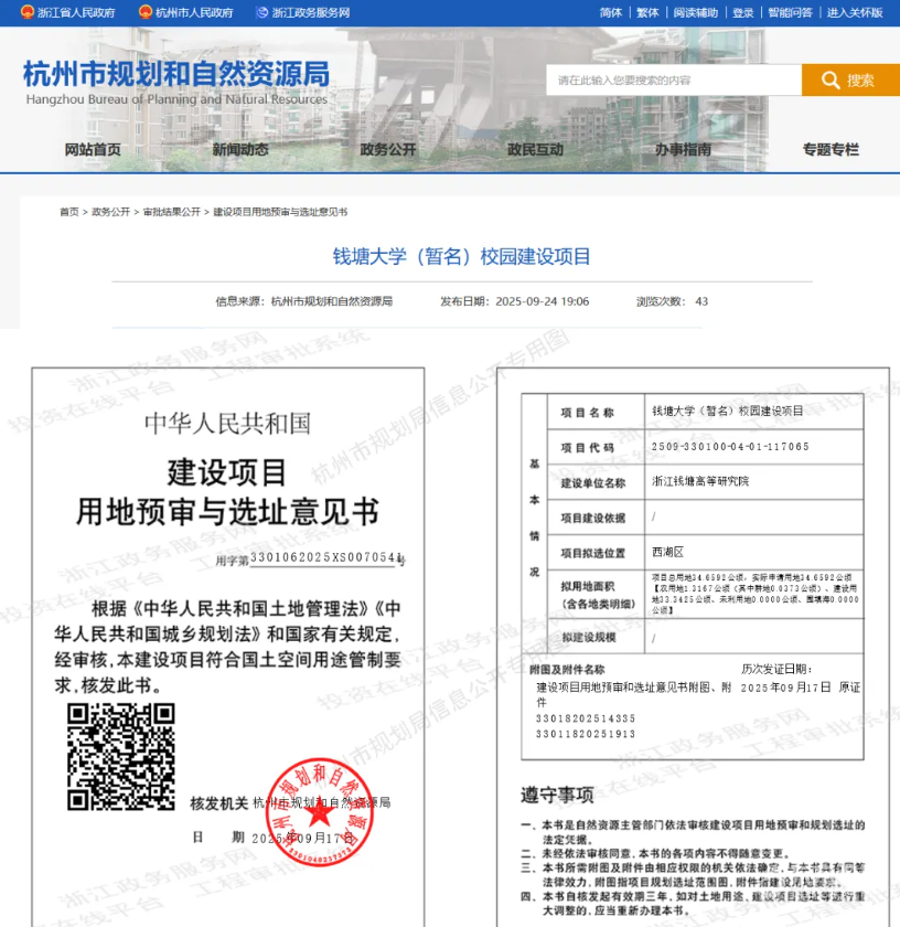 ![]() 从2024年底,杭州市政府就有透露筹办“钱塘大学”的有关事宜。2024年12月27日,中共杭州市委十三届八次全会暨市委经济工作会议召开。会上在提到“以科技创新引领新质生产力发展”时明确提出,杭州将推动筹办“钱塘大学”,力争全年新引育顶尖人才15名以上、各级领军人才500名、35岁以下大学生35万名以上。 2025年1月22日,农夫山泉母公司养生堂集团董事长钟睒睒在公司年会上宣布,计划在未来十年捐赠400亿元人民币用于筹办杭州的“钱塘大学”。钟睒睒强调,这所大学将致力于贡献知识、拓宽人类知识边界,并注重科学与技术的双重发展,实现从0到1的科研创新以及技术的转化应用。据澎湃新闻报道,钱塘大学或依托浙江钱塘基础科学研究院筹建。 2025年5月22日,杭州市十四届人大五次会议开幕,市长姚高员在作政府工作报告时提及今年将“积极筹办钱塘大学”。 同年6月,杭州市行政审批服务管理办公室网站刊发一则由杭州市规划和自然资源局供稿的文章《钱塘大学获批!为高等教育发展注入强劲动力》显示,钱塘大学用地已于5月17日获得省政府批准,为钱塘大学落地建设筑牢了土地要素根基。 项目用地涉及转塘单元XH100201-09、XH100201-18、XH100201-35地块及周边配套道路,用地总面积达36.3公顷。 作为杭州市重点谋划的高等教育项目,钱塘大学选址西湖区之江转塘板块,自筹备以来备受社会各界关注。学校聚焦人工智能、数字经济等前沿交叉学科和新兴学科领域,致力于打造成为一所特色鲜明、具有影响力的新型研究型大学。它不仅是高等教育体系的重要补充,也体现了杭州对科技创新和人才培养的高度重视。 这次用地获批,是钱塘大学建设进程中具有里程碑意义的关键一步。随着土地要素保障到位,相信在不久的将来,一所现代化的高等学府将拔地而起,为杭州高等教育高质量发展注入新的动能,为城市发展注入源源不断的活力。 来源:杭州市行政审批服务管理办公室、杭州市规划和自然资源局、现代金报 |