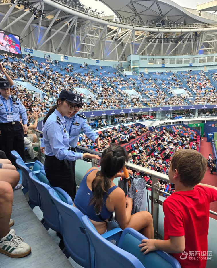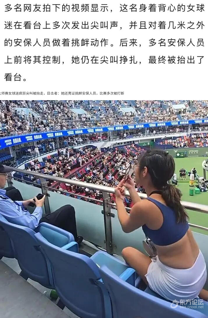 10月1日,ATP1000上海网球大师赛赛场上,一名女球迷因多次尖叫干扰比赛,被安保人员抬出场。