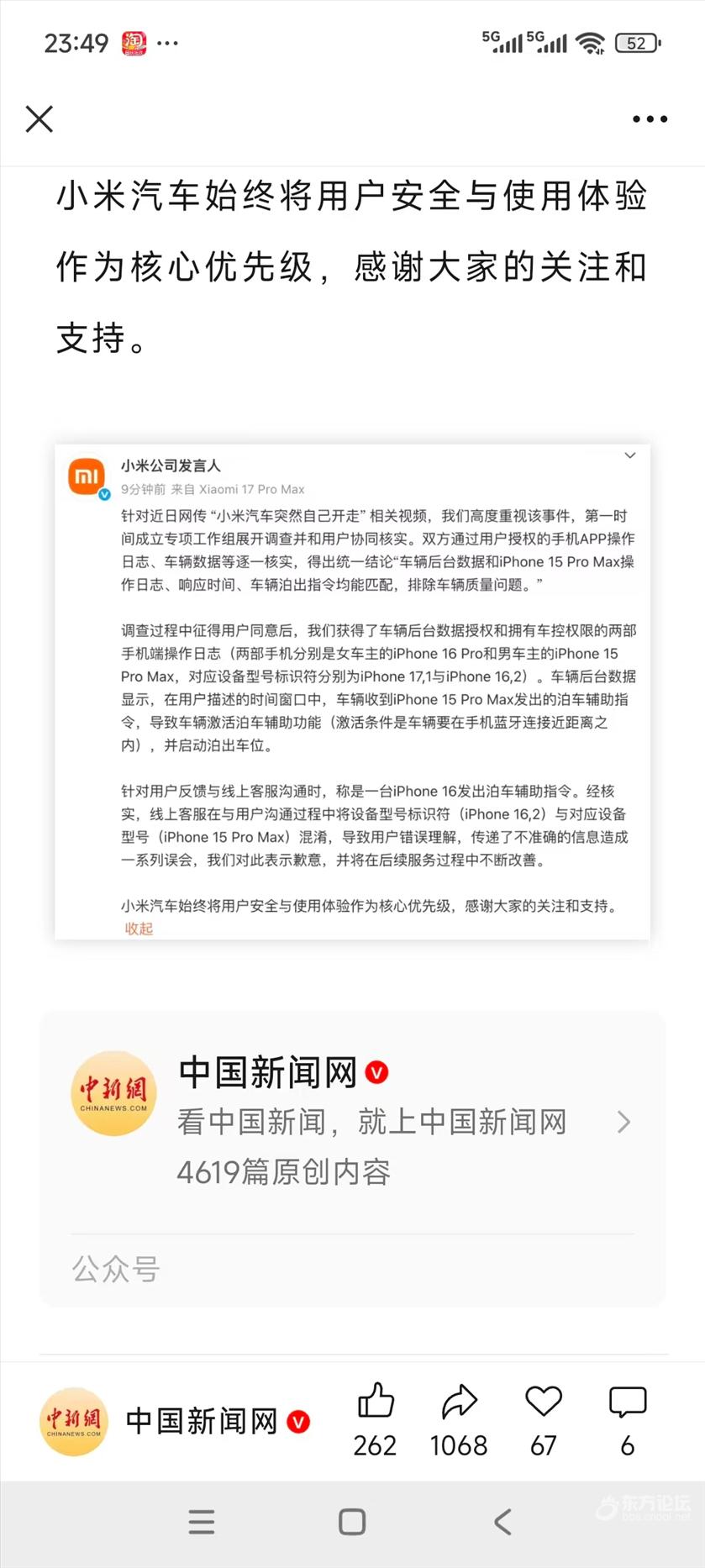 事件发生后,小米客服称可能是车主误触手机导致车辆启动,车主对此否认,并公开监控视频,强调车辆启动时自己未操作手机。10月3日晚,小米公司发布调查结果,称车辆后台数据显示是男车主的iPhone 15 Pro Max发出了泊车辅助指令,但车主未对此说法发表承认误触的相关言论,仅在小米发言人微博下方留言表示小米汽车团队已和其当面核对数据无误,请大家不要传谣。 |