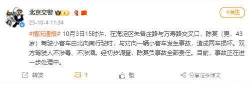 10月4日,北京交警发布情况通报: 10月3日15时许,在海淀区朱各庄路与万寿路交叉口,陈某(男,43岁)驾驶小客车由北向南行驶时,与对向一辆小客车发生事故,造成两车损坏。双方驾驶人不涉毒、不涉酒。经初步调查,陈某负事故全部责任。目前,事故正在进一步处理中。 ![]() 10月3日下午,有网友曝出图片,称知名车评人陈震发生交通事故。事发地辖区交警回应记者称,相关路段确实发生了事故,目前事故正在处理当中。 “陈震劳斯莱斯发生车祸”词条登上热搜第一。 网传照片显示,一辆劳斯莱斯闪灵轿车停在公路上,车身损毁严重,安全气囊弹出。车外人员疑似知名车评人陈震。记者对比该车的车牌号,与此前媒体曝光的车评人陈震车辆为同一号牌。有网友称,该事故发生在万寿路。 记者注意到,10月3日下午4时54分,陈震还转发内容并配文“加油”,不少网友在评论区询问此事。面对网友“听说你逆行”的追问未作回应,仅对“这是你大儿子吗”的提问回复“嗯嗯”。 3日晚7时20分,记者联系事发地辖区交警,值班人员称,当天15时左右,万寿路确实发生了一起交通事故,目前事故还在调查处理当中。至于车型和车主信息,暂未了解。 从现场照片看,这辆挂着京A牌照的闪灵车头已经面目全非,严重凹陷,车内气囊弹出,损失惨重,而它所处的位置正好为逆行。 有内容发布者称,当时这辆闪灵从北向南逆行超速行驶,撞上了一辆白色车,由于速度快,白车被撞飞好几个车道后撞到了绿化带上,车内人员受伤情况未知。 另据三湘都市报记者查询发现,陈震2023年曾在微博发文称自己买车险只买交强险,原因是自己开车规矩而且车多,所以买车损险不划算。 评论区炸锅陈震,知名车评人,萝卜报告创始人。2005年至2006年,陈震能在晚上九、十点钟正常车流量的情况下,仅仅用13分钟就跑完长达32.7公里的整个二环路,得名“二环十三郎”。 |