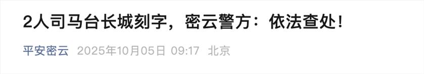 10月5日,北京密云警方发布通报称,近日,两名游客在司马台长城刻字,被依法查处。全文如下: 10月3日,密云分局古北口派出所接古北水镇景区工作人员报警称,有游客在司马台长城景区刻字。接报后,密云警方立即开展工作,经民警实地走访、详细调查核实,于10月4日上午,将刻字人员满某(男,26岁)、刘某某(女,21岁)查获。 经查,俩人于10月3日14时进入景区游玩,16时30分许,满某在司马台长城烽火台墙体上用石子刻画俩人名字,在刘某某的提议下又刻上相应图案。目前,满某、刘某某二人已被密云警方依法给予拘留并处罚款的行政处罚。 ![]() ![]() 相关视频截图 密云警方提示广大游客:游览长城时,请自觉遵守文物保护相关规定,践行文明旅游理念,拒绝任何破坏长城的行为。让我们携手同心,共筑文化遗产保护防线,为传承和弘扬中华优秀传统文化贡献力量。 国庆中秋假期前半程交通出行人数约12.43亿人次 记者5日从交通运输部获悉,10月4日,全社会跨区域人员流动量为30129.11万人次,同比增长6.1%。国庆中秋假期前半程全社会跨区域人员流动量再创历史新高,累计约12.43亿人次,日均值超过3.1亿人次,展现出强劲的出行活力。 具体来看,铁路客运量为1833.4万人次,同比增长4.5%;水路客运量为190.77万人次,同比增长5.6%;民航客运量为231.94万人次,同比增长4.1%。 公路人员流动量(包括高速公路及普通国省道非营业性小客车人员出行量、公路营业性客运量)为27873万人次,同比增长6.2%。其中,公路营业性客运量为3523万人次,同比增长2.5%;高速公路及普通国省道非营业性小客车人员出行量为24350万人次,同比增长6.8%。 从出行结构看,公路出行仍占主导地位,成为公众出行首选。营业性客运方面,铁路、公路、水路、民航各类运输方式客运量均实现同比增长,整体旅客运输态势稳中向好。从区域分布看,北京、上海、广州、深圳等一线城市及成都、西安等热门旅游城市仍是公众假期出行首选。 |
