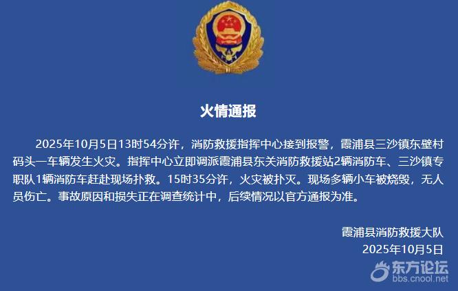 据网友拍摄的现场视频显示,一处空地上,一辆悬挂绿色号牌的新能源汽车首先起火。约半小时后,火势波及周边车辆,多辆车被烧至仅剩车架。事发后,当地消防及公安部门抵达现场开展救援。 ![]() ![]() ![]() ![]() ![]() 5日晚,福建省宁德市霞浦县消防救援大队发布火情通报称,当日13时54分许,消防救援指挥中心接到报警,霞浦县三沙镇东壁村码头一车辆发生火灾。指挥中心立即调派霞浦县东关消防救援站2辆消防车、三沙镇专职队1辆消防车赶赴现场扑救。15时35分许,火灾被扑灭。现场多辆小车被烧毁,无人员伤亡。事故原因和损失正在调查统计中,后续情况以官方通报为准。 ![]() 据霞浦县融媒体中心10月3日报道,国庆假期首日,东壁村接待游客量达20016人次,当地民宿平均入住率超90%,呈现“一房难求”的火爆态势。 |