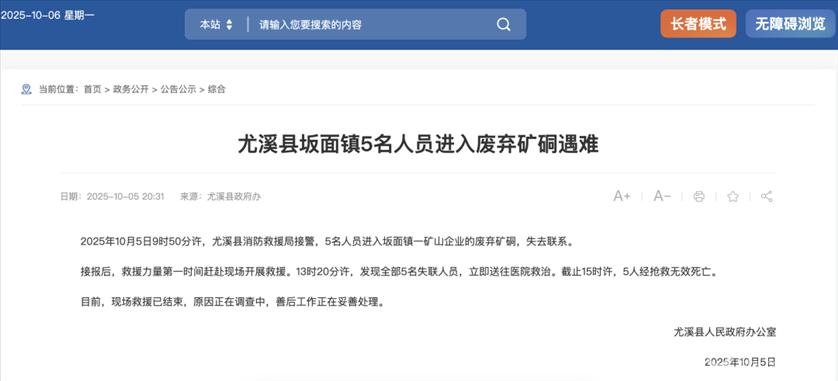 10月5日,据福建省三明市尤溪县政府网站消息,当日9时50分许,尤溪县消防救援局接警,5名人员进入坂面镇一矿山企业的废弃矿硐,失去联系。接报后,救援力量第一时间赶赴现场开展救援。13时20分许,发现全部5名失联人员,立即送往医院救治。截至15时许,5人经抢救无效死亡。现场救援已结束,原因正在调查中,善后工作正在妥善处理。