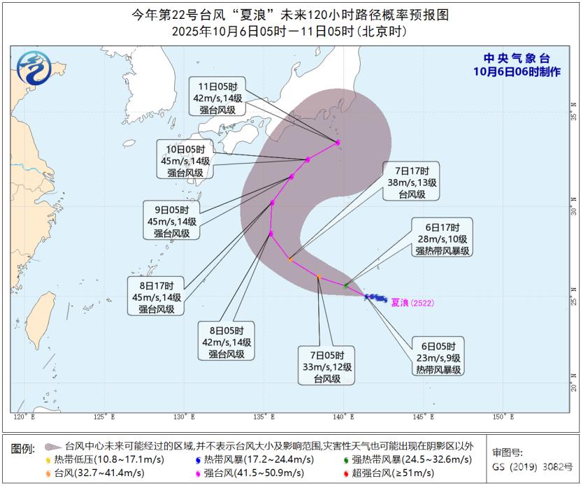 而今年第22号台风“夏浪”的中心今天(6日)早上5点钟位于日本九州岛东南方向约1350公里的西北太平洋洋面上,中心附近最大风力有9级(23米/秒),中心最低气压为990百帕,七级风圈半径160-300公里。预计“夏浪”将以每小时10-15公里的速度向西偏北方向移动,强度逐渐增强。