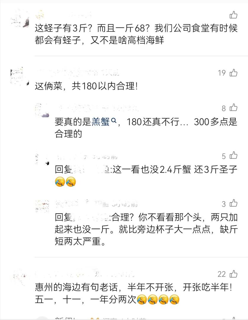 ![]() 都市现场 71 网友也觉得价格不合理。 ![]() 向阳视频记者致电餐厅老板得知,顾客点菜时已明确告知价格与斤数,实际收费比标价还低不少。膏蟹标价288元/斤,但进货价约160元/斤,加上人工、租金等经营成本,实际售价为188元/斤。顾客所点的螃蟹重2.4斤,蛏子3斤(单价68元/斤),加上2人茶位费共6元,总计661元。 最后,老板表示将公开监控视频并强调所有菜品明码标价,目前仍不清楚对方诉求,曾尝试联系顾客未获回应。此外,老板提到,若顾客认为价格不合理,可通过有关部门投诉,但要以正当理由诉求。 向阳VIDEO 201 记者注意到,10月6日晚上,消费者发布消息称,双方已经调解处理此事。记者也联系了消费者,但是对方未予以回复。 对此,10月7日上午,记者联系惠州市大亚湾经济技术开发区霞涌街道办事处,工作人员回应称市场监督管理部门在处理此事。随后,记者也联系了事发属地市场监督管理局,值班工作人员回应称,已经联系商家和投诉人协调处理完了。 |